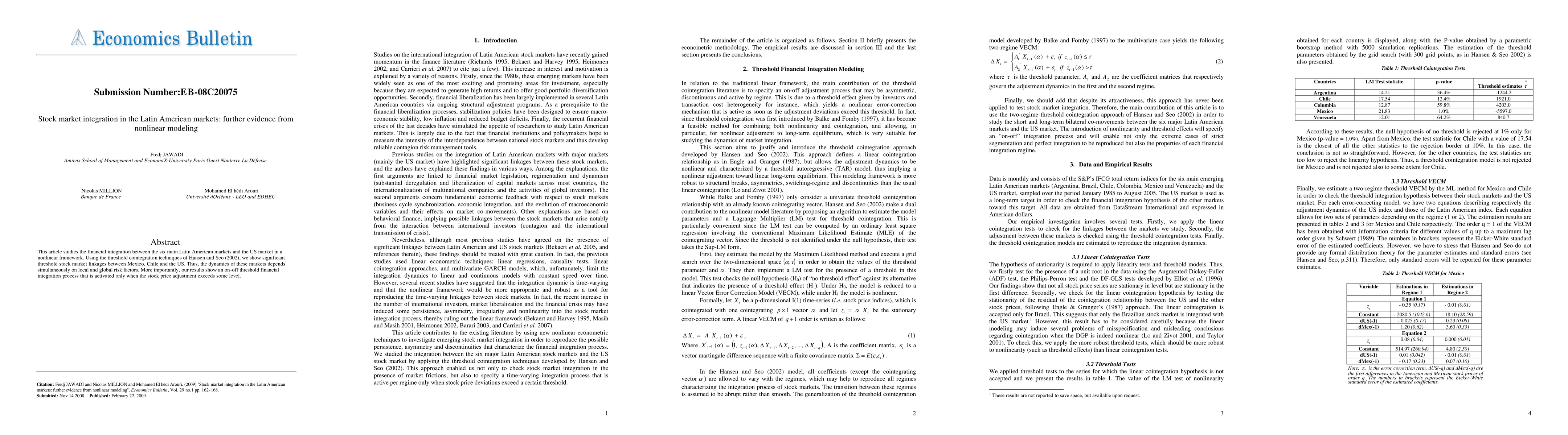 This paper employs nonlinear modeling to investigate financial integration in six Latin American markets relative to the US market, revealing significant threshold cointegration between Mexico, Chile, and the US. The findings indicate an on-off integration process activated only when stock price adjustments surpass a certain threshold.