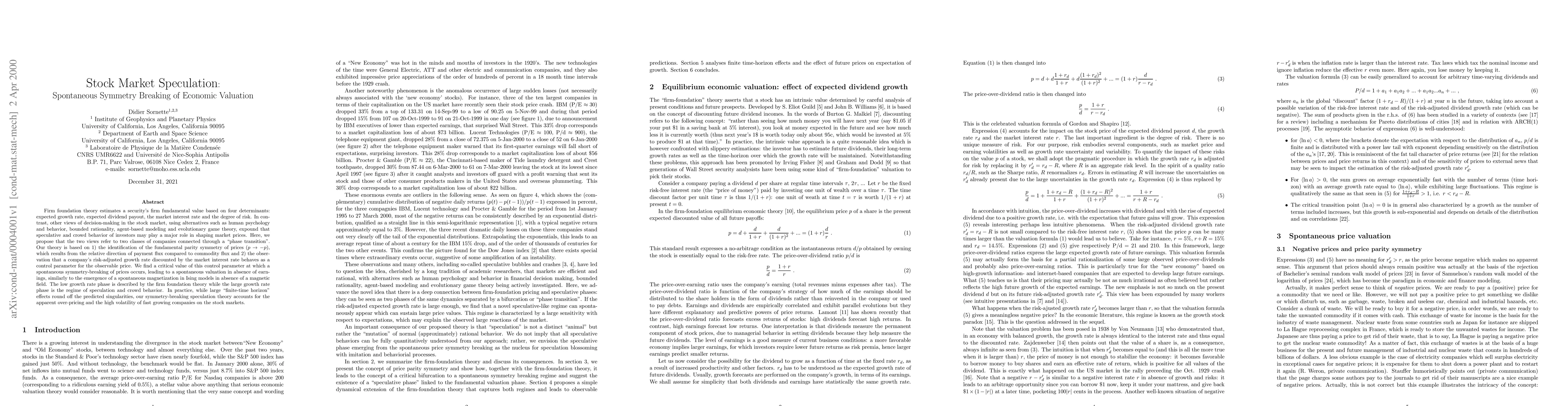 Firm foundation theory estimates a security's firm fundamental value based on four determinants: expected growth rate, expected dividend payout, the market interest rate and the degree of risk. In contrast, other views of decision-making in the stock market, using alternatives such as human psychology and behavior, bounded rationality, agent-based modeling and evolutionary game theory, expound that speculative and crowd behavior of investors may play a major role in shaping market prices. Here, we propose that the two views refer to two classes of companies connected through a ``phase transition''. Our theory is based on 1) the identification of the fundamental parity symmetry of prices ($p \to -p$), which results from the relative direction of payment flux compared to commodity flux and 2) the observation that a company's risk-adjusted growth rate discounted by the market interest rate behaves as a control parameter for the observable price. We find a critical value of this control parameter at which a spontaneous symmetry-breaking of prices occurs, leading to a spontaneous valuation in absence of earnings, similarly to the emergence of a spontaneous magnetization in Ising models in absence of a magnetic field. The low growth rate phase is described by the firm foundation theory while the large growth rate phase is the regime of speculation and crowd behavior. In practice, while large ``finite-time horizon'' effects round off the predicted singularities, our symmetry-breaking speculation theory accounts for the apparent over-pricing and the high volatility of fast growing companies on the stock markets.