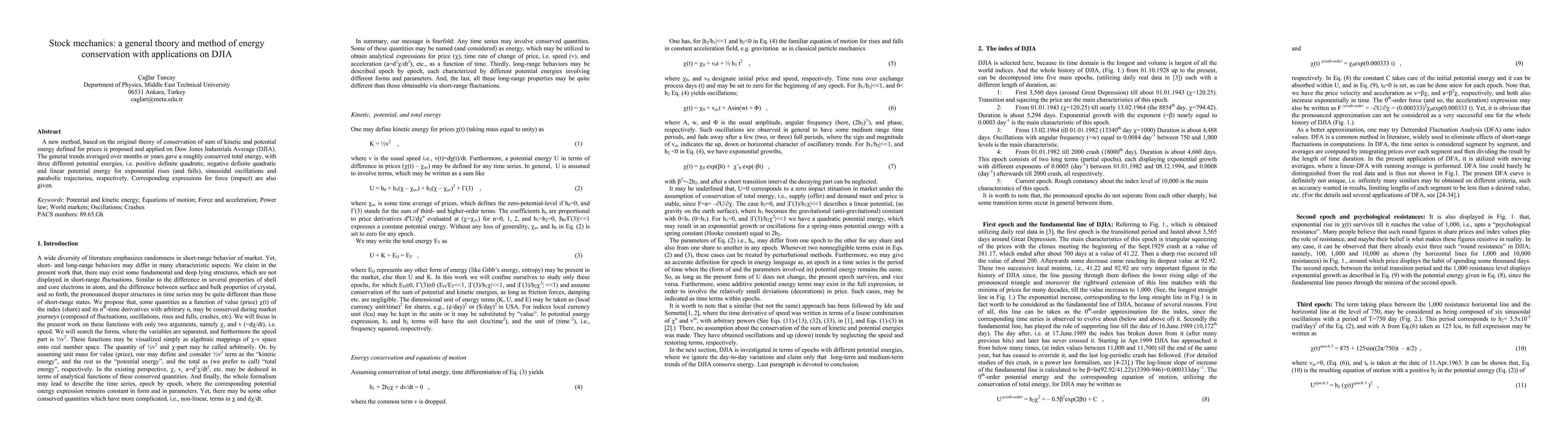 A new method, based on the original theory of conservation of sum of kinetic and potential energy defined for prices is proposed and applied on Dow Jones Industrials Average (DJIA). The general trends averaged over months or years gave a roughly conserved total energy, with three different potential energies, i.e. positive definite quadratic, negative definite quadratic and linear potential energy for exponential rises (and falls), sinusoidal oscillations and parabolic trajectories, respectively. Corresponding expressions for force (impact) are also given. Keywords: