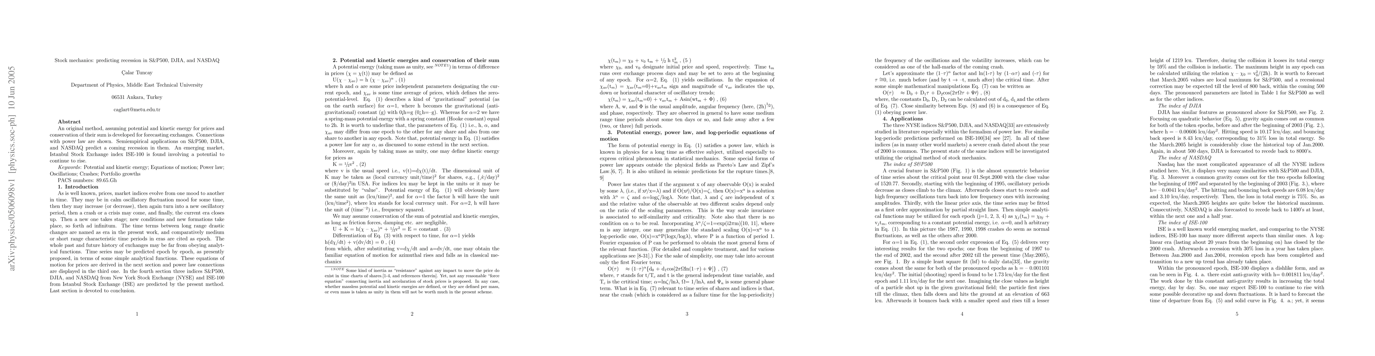 An original method, assuming potential and kinetic energy for prices and conservation of their sum is developed for forecasting exchanges. Connections with power law are shown. Semiempirical applications on S&P500, DJIA, and NASDAQ predict a coming recession in them. An emerging market, Istanbul Stock Exchange index ISE-100 is found involving a potential to continue to rise.