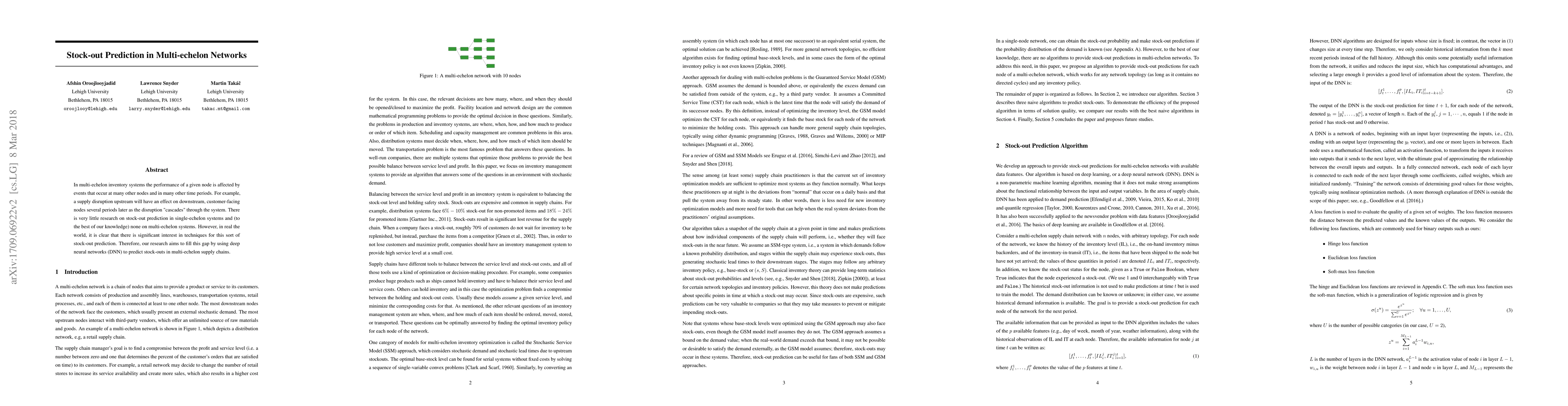 This paper investigates stock-out prediction in multi-echelon inventory systems using deep neural networks (DNN). It addresses the lack of research in this area by developing predictive models to anticipate stock-outs that cascade through interconnected nodes over time.