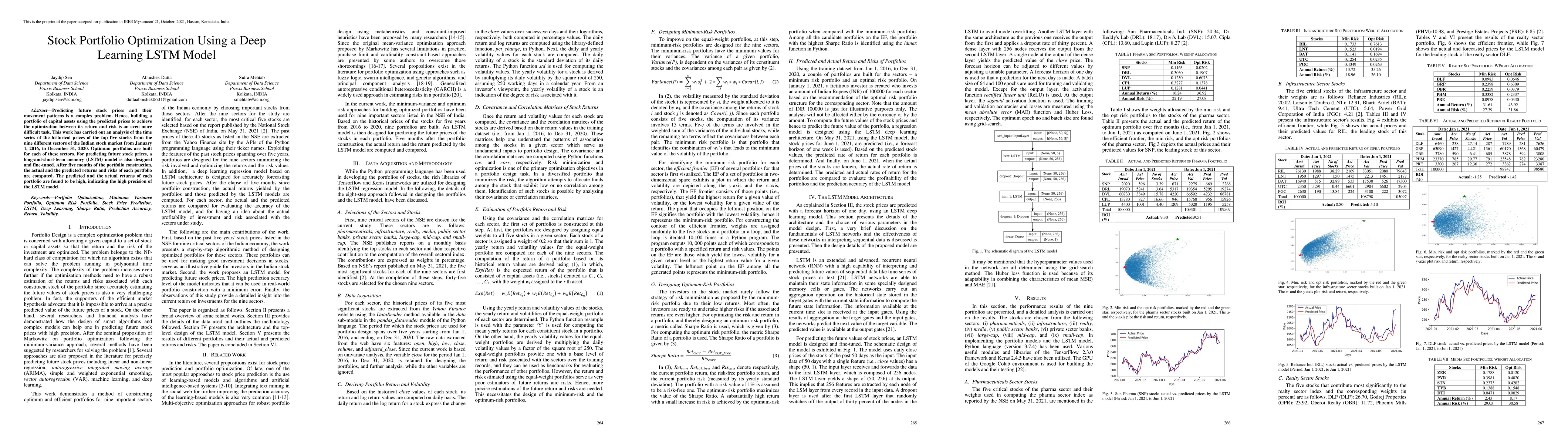 This research optimizes stock portfolios using an LSTM model to predict future stock prices and movements. The study analyzes historical prices of top five stocks from nine Indian sectors, constructing optimal portfolios and finding high precision in predicted versus actual returns.