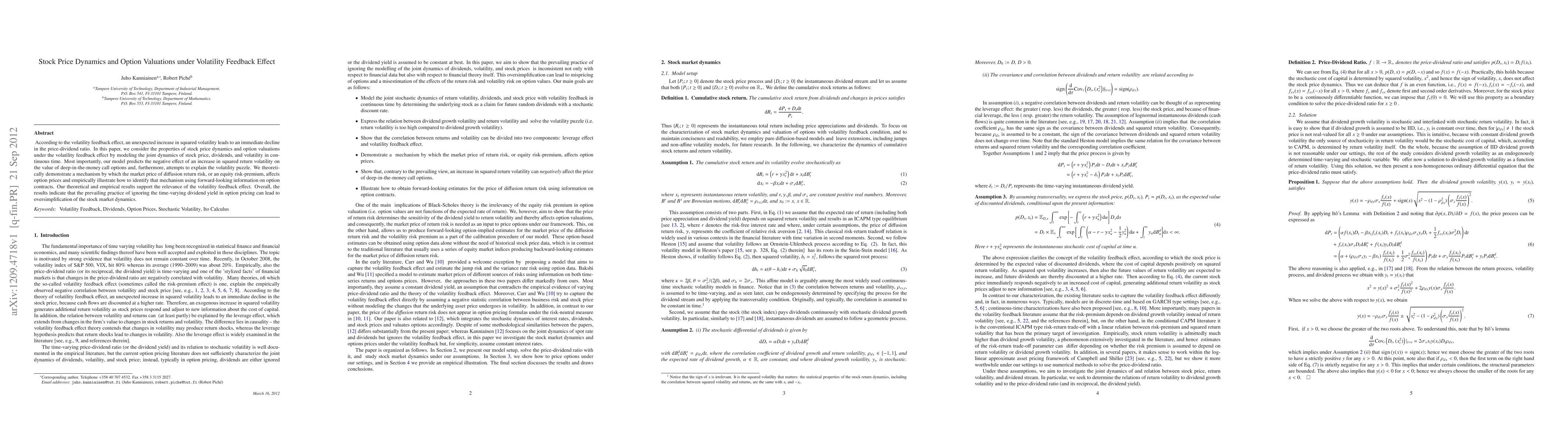 According to the volatility feedback effect, an unexpected increase in squared volatility leads to an immediate decline in the price-dividend ratio. In this paper, we consider the properties of stock price dynamics and option valuations under the volatility feedback effect by modeling the joint dynamics of stock price, dividends, and volatility in continuous time. Most importantly, our model predicts the negative effect of an increase in squared return volatility on the value of deep-in-the-money call options and, furthermore, attempts to explain the volatility puzzle. We theoretically demonstrate a mechanism by which the market price of diffusion return risk, or an equity risk-premium, affects option prices and empirically illustrate how to identify that mechanism using forward-looking information on option contracts. Our theoretical and empirical results support the relevance of the volatility feedback effect. Overall, the results indicate that the prevailing practice of ignoring the time-varying dividend yield in option pricing can lead to oversimplification of the stock market dynamics.