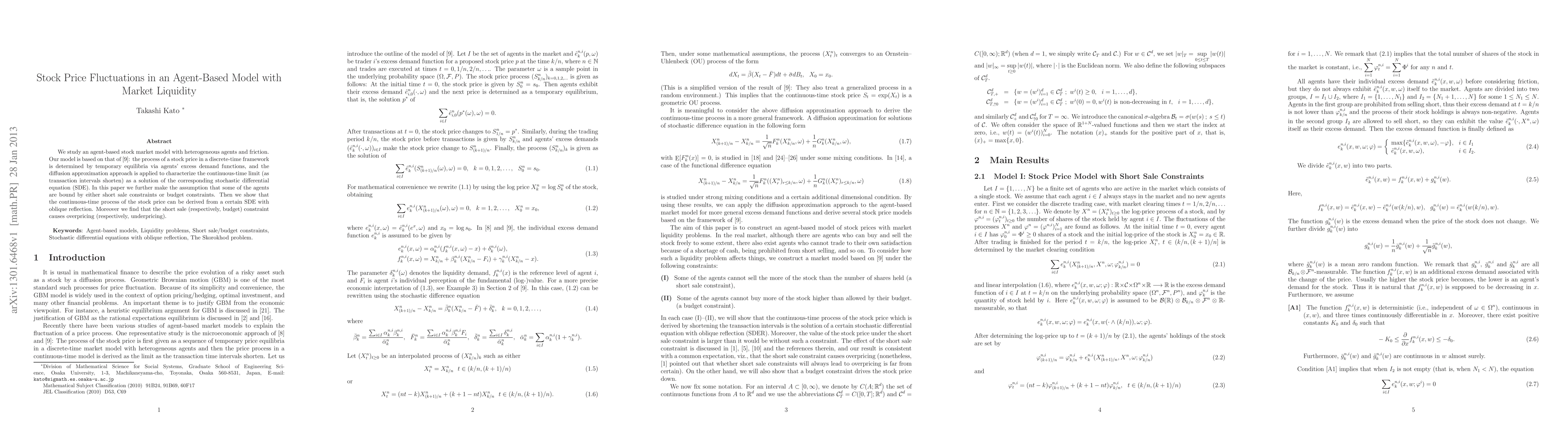 This paper develops an agent-based stock market model with heterogeneous agents and liquidity constraints, showing that short sale and budget constraints lead to overpricing and underpricing, respectively. The model transitions from a discrete-time framework to a continuous-time stochastic differential equation with oblique reflection.