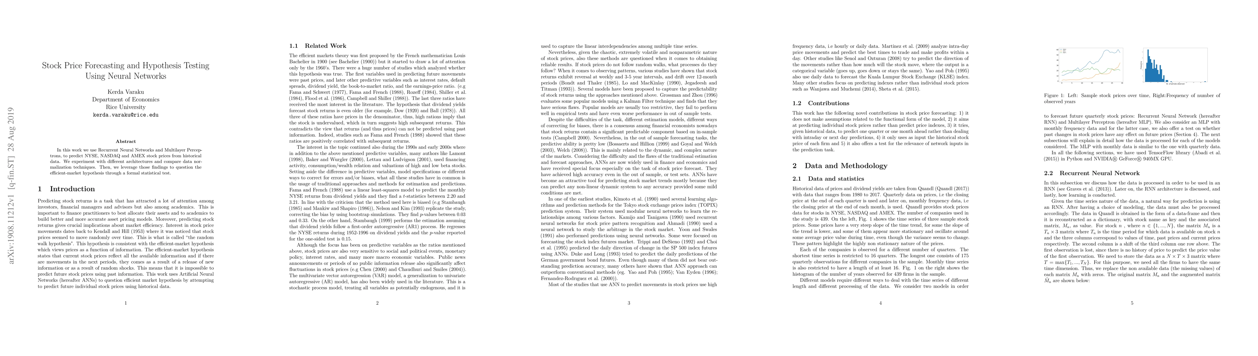 In this work we use Recurrent Neural Networks and Multilayer Perceptrons to predict NYSE, NASDAQ and AMEX stock prices from historical data. We experiment with different architectures and compare data normalization techniques. Then, we leverage those findings to question the efficient-market hypothesis through a formal statistical test.