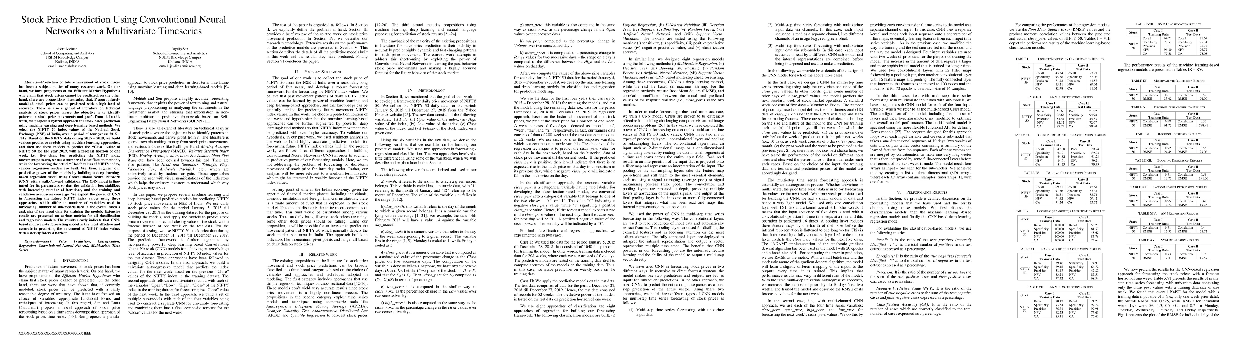 Prediction of future movement of stock prices has been a subject matter of many research work. In this work, we propose a hybrid approach for stock price prediction using machine learning and deep learning-based methods. We select the NIFTY 50 index values of the National Stock Exchange of India, over a period of four years, from January 2015 till December 2019. Based on the NIFTY data during the said period, we build various predictive models using machine learning approaches, and then use those models to predict the Close value of NIFTY 50 for the year 2019, with a forecast horizon of one week. For predicting the NIFTY index movement patterns, we use a number of classification methods, while for forecasting the actual Close values of NIFTY index, various regression models are built. We, then, augment our predictive power of the models by building a deep learning-based regression model using Convolutional Neural Network with a walk-forward validation. The CNN model is fine-tuned for its parameters so that the validation loss stabilizes with increasing number of iterations, and the training and validation accuracies converge. We exploit the power of CNN in forecasting the future NIFTY index values using three approaches which differ in number of variables used in forecasting, number of sub-models used in the overall models and, size of the input data for training the models. Extensive results are presented on various metrics for all classification and regression models. The results clearly indicate that CNN-based multivariate forecasting model is the most effective and accurate in predicting the movement of NIFTY index values with a weekly forecast horizon.