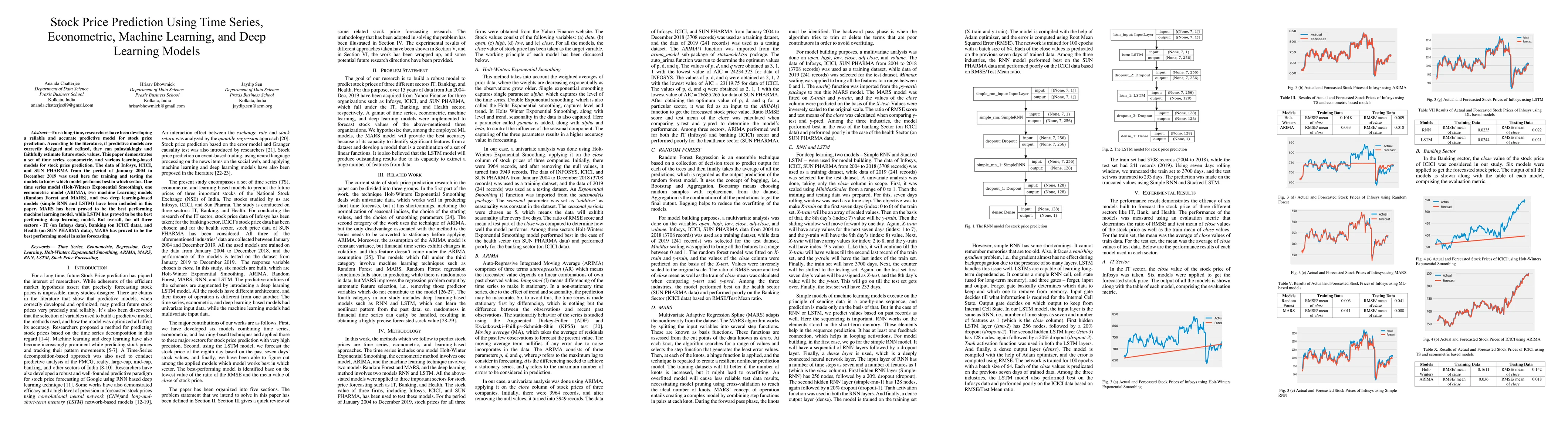 This paper compares various predictive models for stock price forecasting, including time series, econometric, machine learning, and deep learning approaches. MARS emerged as the best-performing machine learning model, while LSTM excelled in deep learning, but MARS was ultimately the top performer across IT, Banking, and Health sectors.