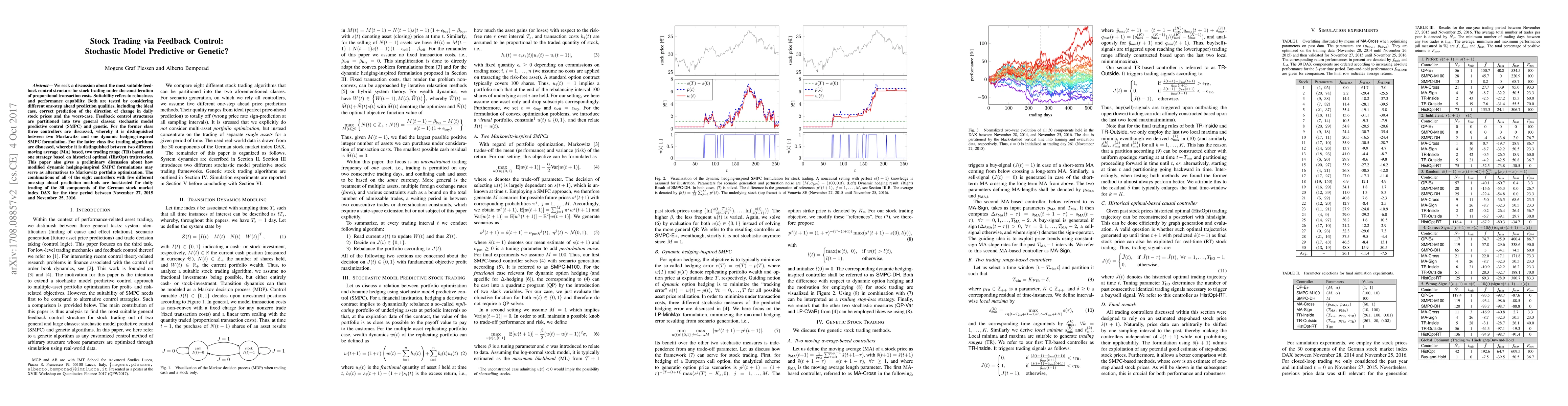 This paper compares the performance and robustness of stochastic model predictive control (SMPC) and genetic trading algorithms for stock trading, considering proportional transaction costs. It evaluates eight controllers and five prediction methods through backtesting on the DAX 30 components from November 2015 to November 2016.