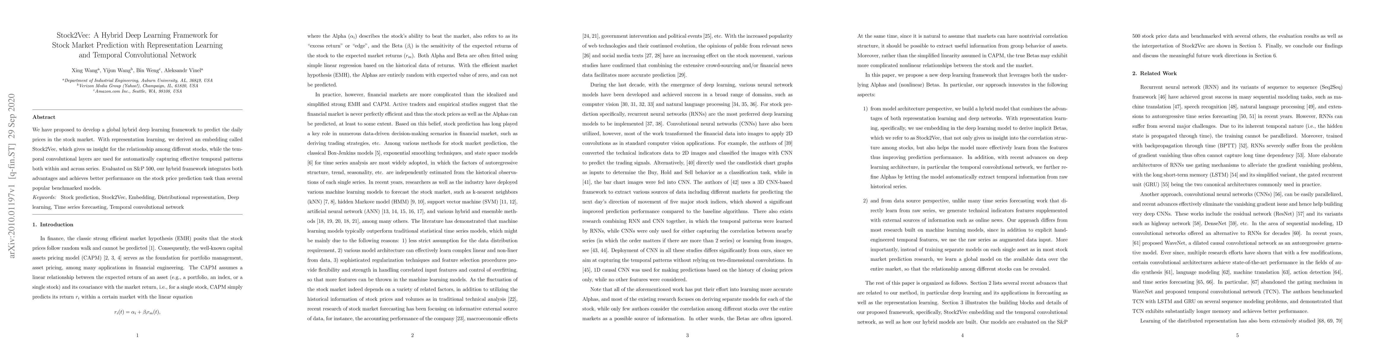 Summary: Stock2Vec is a hybrid deep learning framework combining representation learning and temporal convolutional networks for improved stock market prediction. It outperforms benchmark models by effectively capturing temporal patterns and relationships among different stocks.