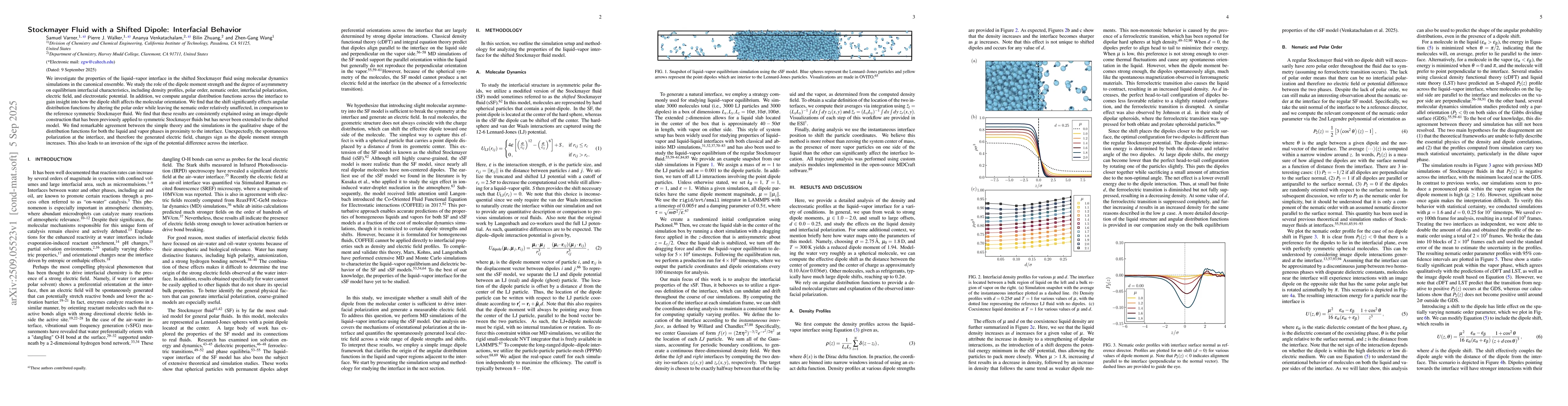 We investigate the properties of the liquid-vapor interface in the shifted Stockmayer fluid using molecular dynamics simulations in the canonical ensemble. We study the role of the dipole moment strength and the degree of asymmmetry on equilibrium interfacial characteristics, including density profiles, polar order, nematic order, interfacial polarization, electric field, and electrostatic potential. In addition, we compute angular distribution functions across the interface to gain insight into how the dipole shift affects the molecular orientation. We find that the shift significantly effects angular distribution functions by altering the polar order while leaving the nematic order relatively unaffected, in comparison to the reference symmetric Stockmayer fluid. We find that these results are consistently explained using an image-dipole construction that has been previously applied to symmetric Stockmayer fluids but has never been extended to the shifted model. We find remarkable agreement between the simple theory and the simulations in the qualitative shape of the distribution functions for both the liquid and vapor phases in proximity to the interface. Unexpectedly, the spontaneous polarization at the interface, and therefore the generated electric field, changes sign as the dipole moment strength increases. This also leads to an inversion of the sign of the potential difference across the interface.