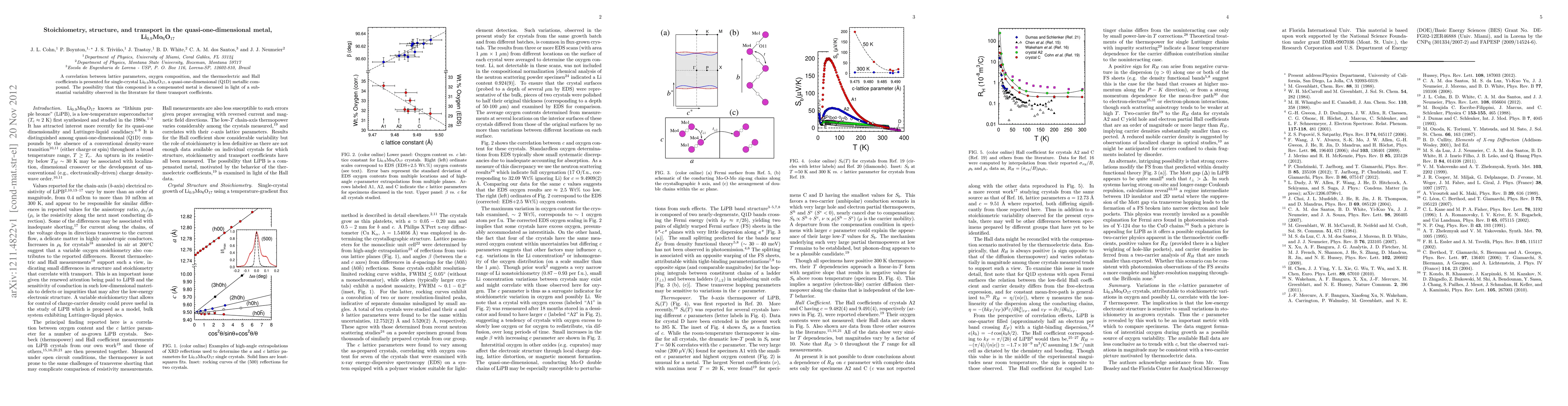 A correlation between lattice parameters, oxygen composition, and the thermoelectric and Hall coefficients is presented for single-crystal Li(0.9)Mo(6)O(17), a quasi-one-dimensional (Q1D) metallic compound. The possibility that this compound is a compensated metal is discussed in light of a substantial variability observed in the literature for these transport coefficients.