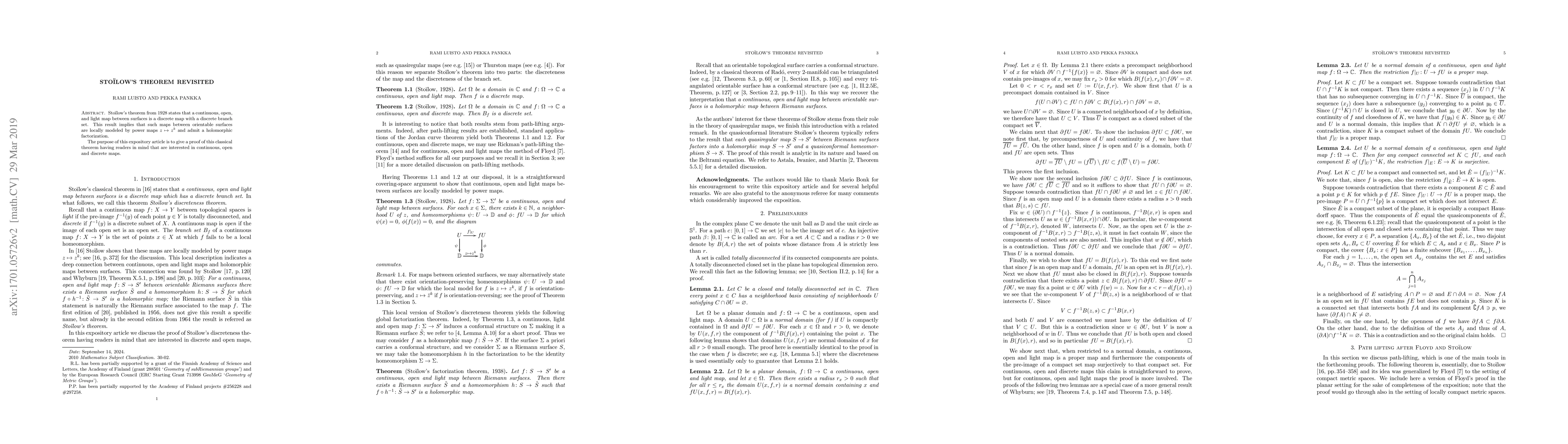 Sto\"ilow's theorem from 1928 states that a continuous, open, and light map between surfaces is a discrete map with a discrete branch set. This result implies that such maps between orientable surfaces are locally modeled by power maps $z\mapsto z^k$ and admit a holomorphic factorization. The purpose of this expository article is to give a proof of this classical theorem having readers in mind that are interested in continuous, open and discrete maps.