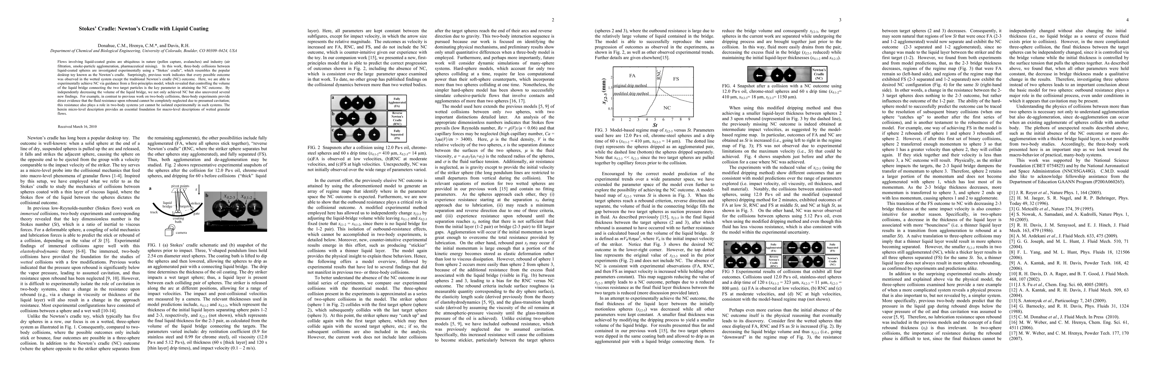 Flows involving liquid-coated grains are ubiquitous in nature (pollen capture, avalanches) and industry (air filtration, smoke-particle agglomeration, pharmaceutical mixing). In this work, three-body collisions between liquid-coated spheres are investigated experimentally using a "Stokes' cradle", which resembles the popular desktop toy known as the Newton's cradle. Surprisingly, previous work indicates that every possible outcome was observed in the wetted system except the traditional Newton's cradle (NC) outcome. Here, we are able to experimentally achieve NC via guidance from a first-principles model, which revealed that controlling the volume of the liquid bridge connecting the two target particles is the key parameter in attaining the NC outcome. By independently decreasing the volume of the liquid bridge, we not only achieved NC but also uncovered several new findings. For example, in contrast to previous work on two-body collisions, three-body experiments provide direct evidence that the fluid resistance upon rebound cannot be completely neglected due to presumed cavitation; this resistance also plays a role in two-body systems yet cannot be isolated experimentally in such systems. The herein micro-level description provides an essential foundation for macro-level descriptions of wetted granular flows.