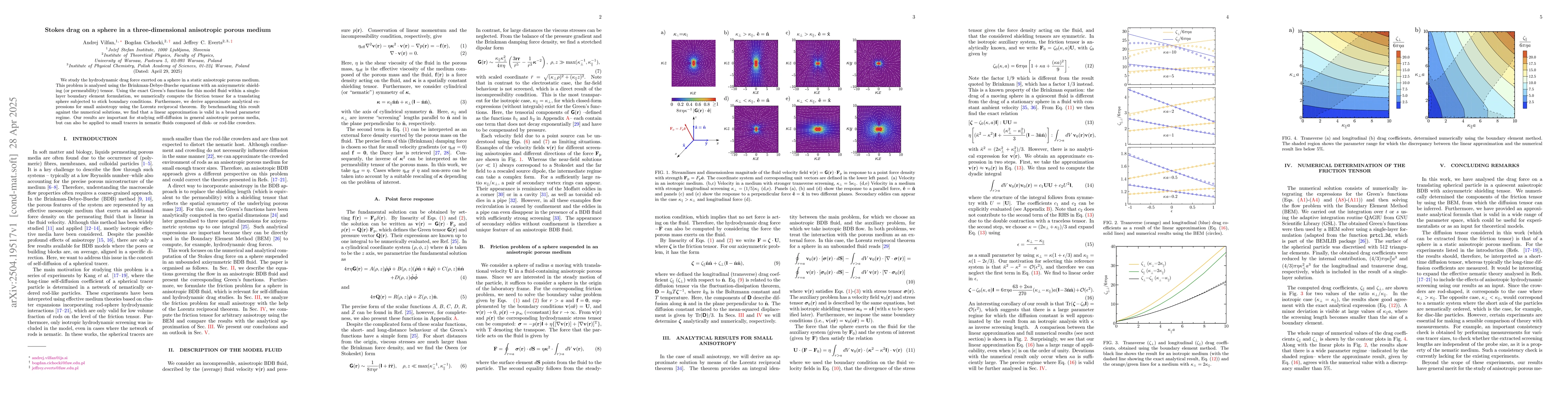 Development of a numerical-analytical framework combining Brinkman-Debye-Bueche equations, axisymmetric permeability tensor, and boundary element formulation for computing drag force in anisotropic porous media.