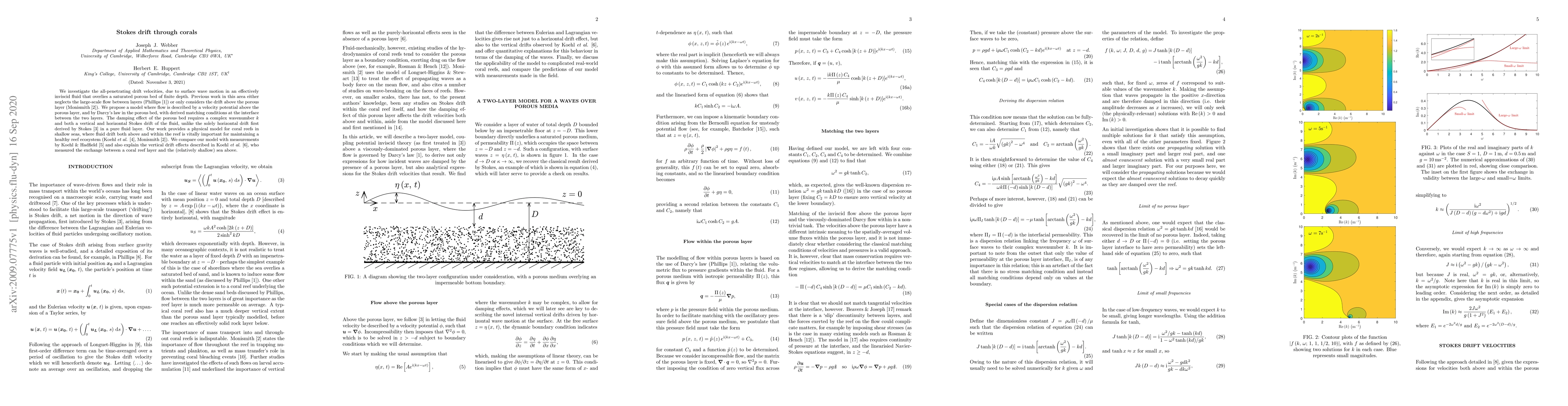 We investigate the all-penetrating drift velocities, due to surface wave motion in an effectively inviscid fluid that overlies a saturated porous bed of finite depth. Previous work in this area either neglects the large-scale flow between layers [Phillips (1991)] or only considers the drift above the porous layer [(Monismith (2007)]. We propose a model where flow is described by a velocity potential above the porous layer, and by Darcy's law in the porous bed, with derived matching conditions at the interface between the two layers. The damping effect of the porous bed requires a complex wavenumber k and both a vertical and horizontal Stokes drift of the fluid, unlike the solely horizontal drift first derived by Stokes Stokes (1847) in a pure fluid layer. Our work provides a physical model for coral reefs in shallow seas, where fluid drift both above and within the reef is vitally important for maintaining a healthy reef ecosystem [Koehl et al. (1997), Monismith (2007)]. We compare our model with measurements by Koehl \& Hadfield (2004) and also explain the vertical drift effects described in Koehl et al. (2007), who measured the exchange between a coral reef layer and the (relatively shallow) sea above.