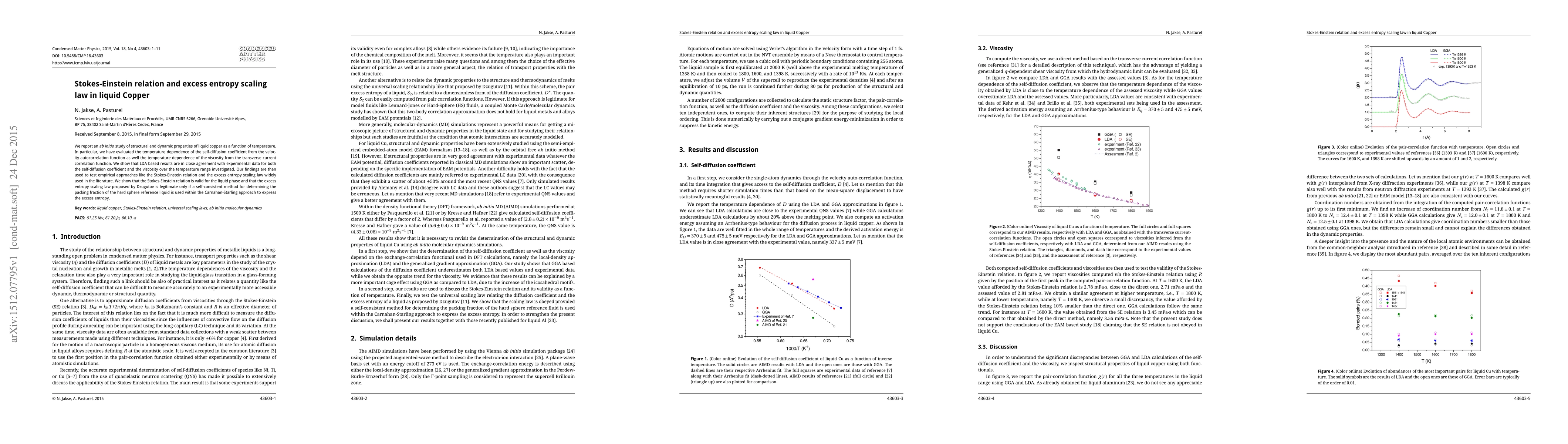 This study investigates the structural and dynamic properties of liquid copper using ab initio methods, confirming the validity of the Stokes-Einstein relation and demonstrating that the excess entropy scaling law holds true only when a self-consistent packing fraction method is applied.