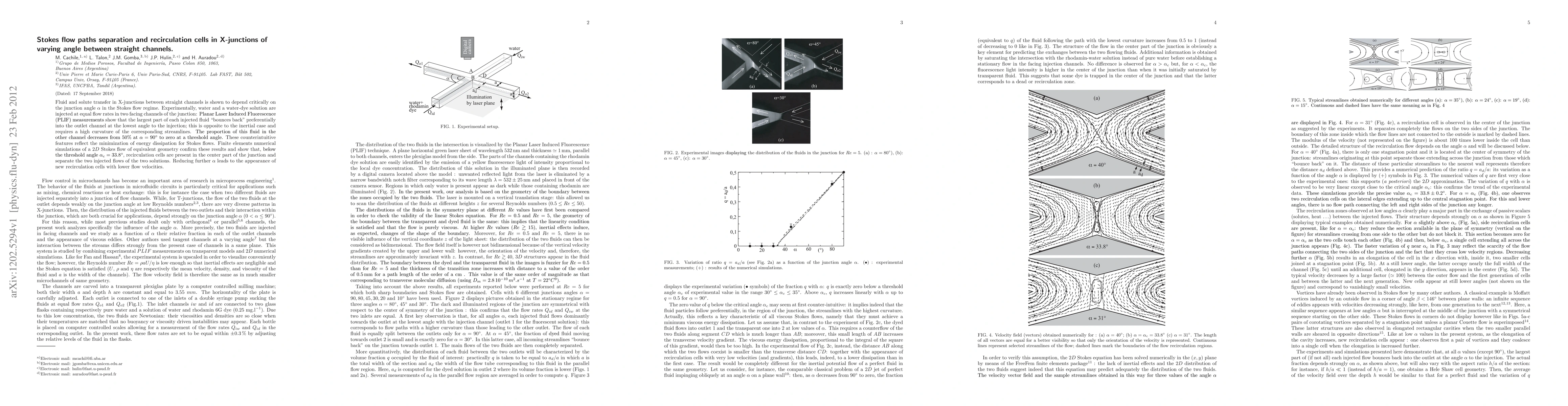 Fluid and solute transfer in X-junctions between straight channels is shown to depend critically on the junction angle in the Stokes flow regime. Experimentally, water and a water-dye solution are injected at equal flow rates in two facing channels of the junction: Planar Laser Induced fluorescence (PLIF) measurements show that the largest part of each injected fluid "bounces back" preferentially into the outlet channel at the lowest angle to the injection; this is opposite to the inertial case and requires a high curvature of the corresponding streamlines. The proportion of this fluid in the other channel decreases from 50% at 90\degree to zero at a threshold angle. These counterintuitive features reflect the minimization of energy dissipation for Stokes flows. Finite elements numerical simulations of a 2D Stokes flow of equivalent geometry con rm these results and show that, below the threshold angle 33.8\degree recirculation cells are present in the center part of the junction and separate the two injected flows of the two solutions. Reducing further leads to the appearance of new recirculation cells with lower flow velocities.