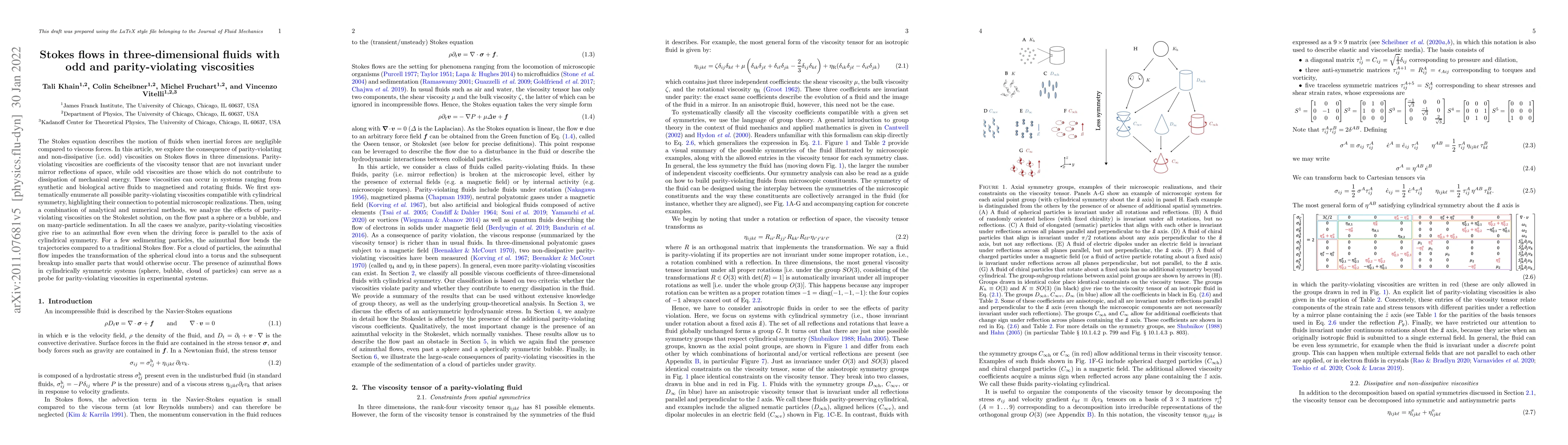 This paper explores the impact of parity-violating and odd viscosities on three-dimensional Stokes flows, revealing that such viscosities induce azimuthal flows even when the driving force aligns with cylindrical symmetry. The study highlights these effects on various scenarios, including flow around spheres, bubbles, and particle sedimentation, and suggests that azimuthal flows can serve as a diagnostic tool for detecting parity-violating viscosities.