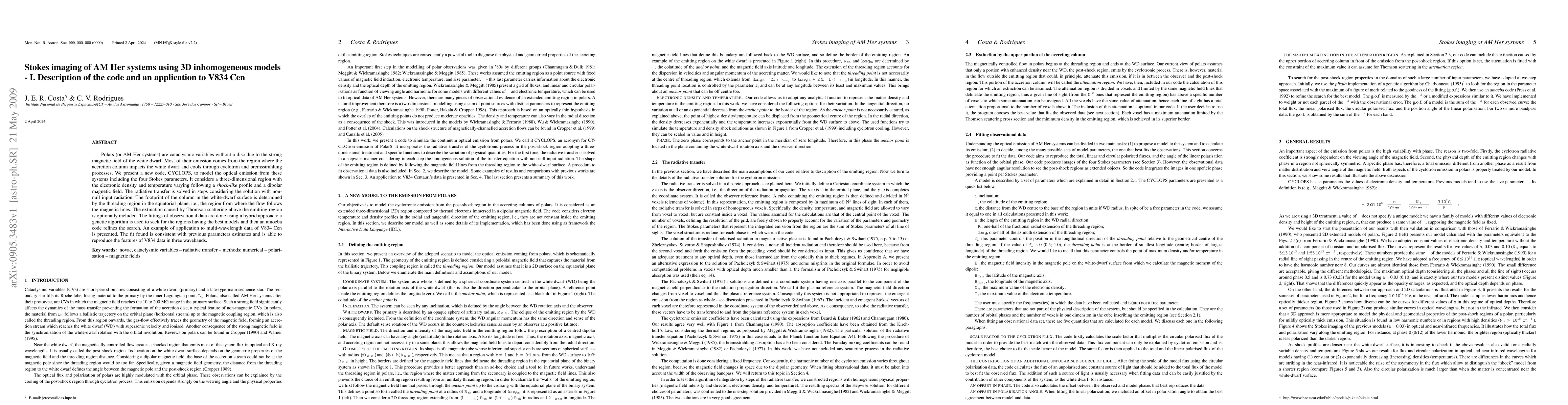 Polars (or AM Her systems) are cataclysmic variables without a disc due to the strong magnetic field of the white dwarf. Most of their emission comes from the region where the accretion column impacts the white dwarf and cools through cyclotron and bremsstrahlung processes. We present a new code, CYCLOPS, to model the optical emission from these systems including the four Stokes parameters. It considers a three-dimensional region with the electronic density and temperature varying following a \textit{shock-like} profile and a dipolar magnetic field. The radiative transfer is solved in steps considering the solution with non-null input radiation. The footprint of the column in the white-dwarf surface is determined by the threading region in the equatorial plane, i.e., the region from where the flow follows the magnetic lines. The extinction caused by Thomson scattering above the emitting region is optionally included. The fittings of observational data are done using a hybrid approach: a genetic algorithm is used to seek for the regions having the best models and then an amoeba code refines the search. An example of application to multi-wavelength data of V834 Cen is presented. The fit found is consistent with previous parameters estimates and is able to reproduce the features of V834 data in three wavebands.