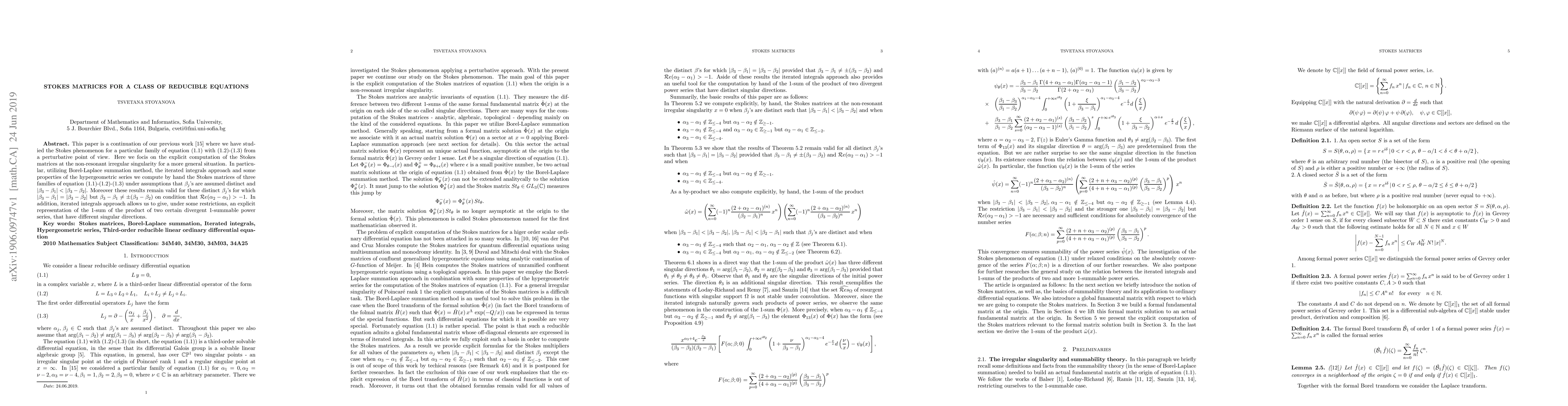 This paper is a continuation of our previous work \cite{St} where we have studied the Stokes phenomenon for a particular family of equation \eqref{initial} with \eqref{form-0}-\eqref{npe} from a perturbative point of view. Here we focus on the explicit computation of the Stokes matrices at the non-resonant irregular singularity for a more general situation. In particular, utilizing Borel-Laplace summation, the iterated integrals approach and some properties of the hypergeometric series we compute by hand the Stokes matrices of three families of equation \eqref{initial}-\eqref{form-0}-\eqref{npe} under assumptions that $\beta_j$'s are distinct and $|\beta_3-\beta_1| < |\beta_3-\beta_2|$. Moreover, these results remain valid for these distinct $\beta_j$'s for which $|\beta_3-\beta_1|=|\beta_3-\beta_2|$ but $\beta_3-\beta_1 \neq \pm (\beta_3-\beta_2)$ on condition that $\mathcal{Re} (\alpha_2-\alpha_1) > -1$. In addition, iterated integrals approach allows us to give, under some restrictions, an explicit representation of the 1-sum of the product of two certain divergent 1-summable power series, that have different singular directions.