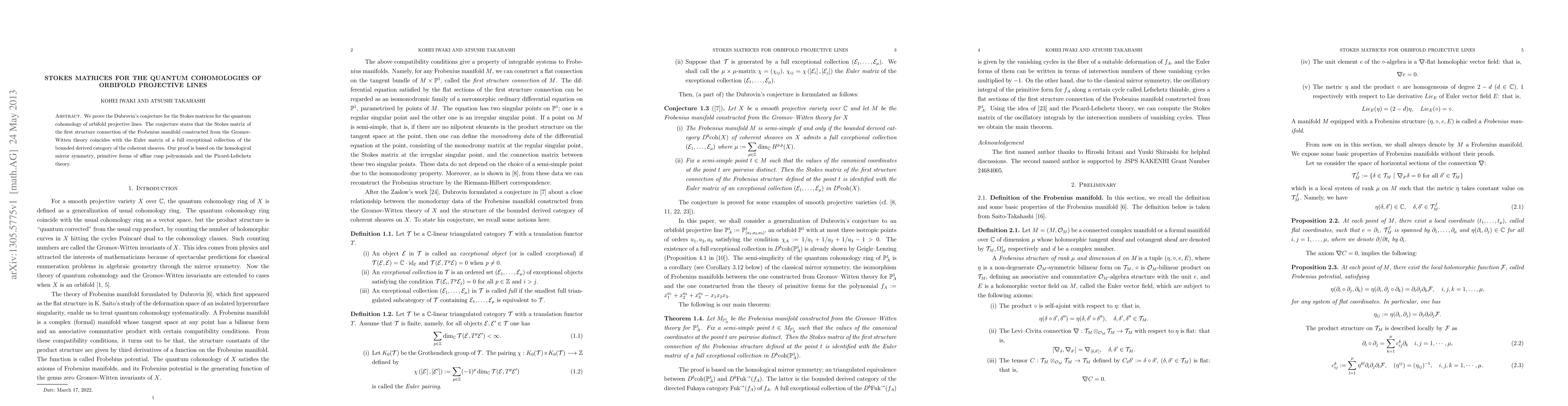 This paper proves Dubrovin's conjecture regarding the Stokes matrices for the quantum cohomology of orbifold projective lines, showing they coincide with the Euler matrix of a full exceptional collection via homological mirror symmetry, primitive forms of affine cusp polynomials, and Picard-Lefschetz theory.