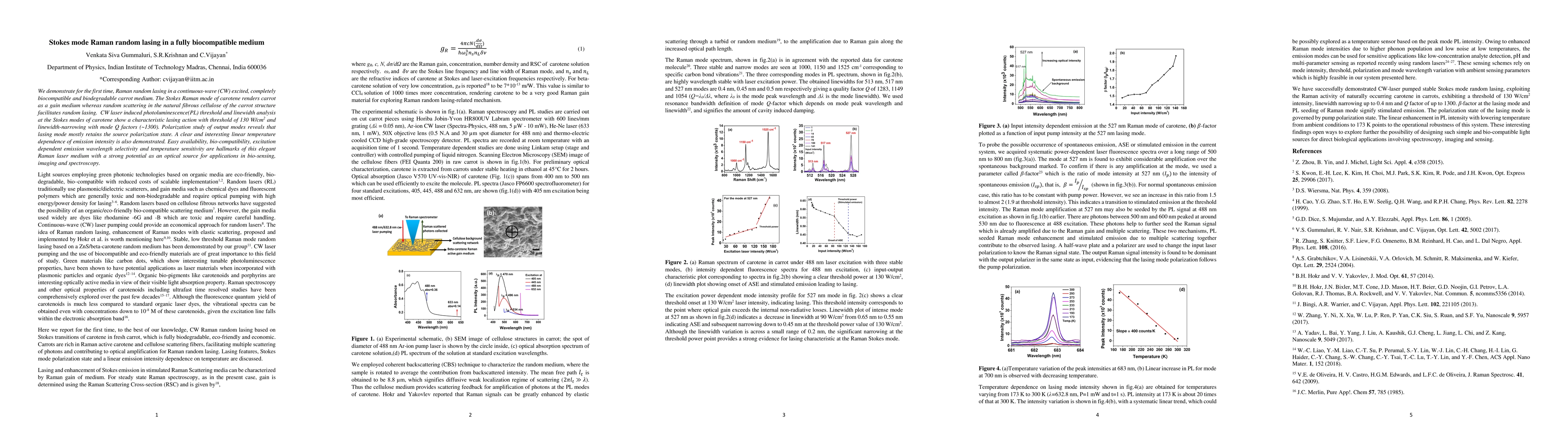 We demonstrate for the first time, Raman random lasing in a continuous-wave (CW) excited, completely biocompatible and biodegradable carrot medium. The Stokes Raman mode of carotene renders carrot as a gain medium whereas random scattering in the natural fibrous cellulose of the carrot structure facilitates random lasing. CW laser induced photoluminescence(PL) threshold and linewidth analysis at the Stokes modes of carotene show a characteristic lasing action with threshold of 130 W/cm2 and linewidth-narrowing with mode Q factors (~1300). Polarization study of output modes reveals that lasing mode mostly retains the source polarization state. A clear and interesting linear temperature dependence of emission intensity is also demonstrated. Easy availability, bio-compatibility, excitation dependent emission wavelength selectivity and temperature sensitivity are hallmarks of this elegant Raman laser medium with a strong potential as an optical source for applications in bio-sensing, imaging and spectroscopy.
