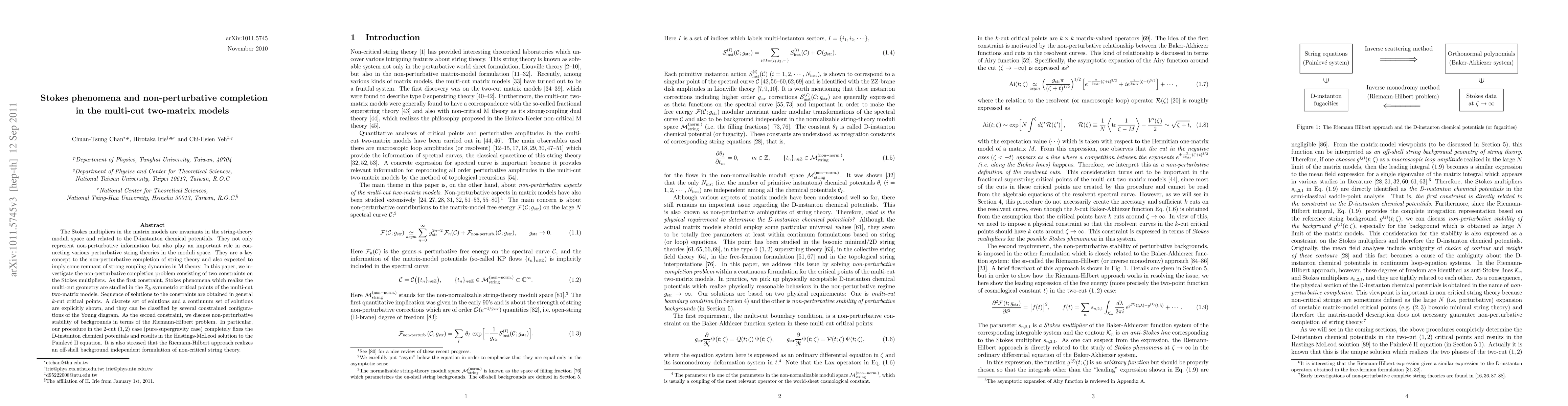 Researchers investigate the non-perturbative completion of string theory using Stokes multipliers in two-matrix models, finding solutions to constraints that realize multi-cut geometry and stable backgrounds via Riemann-Hilbert problems.