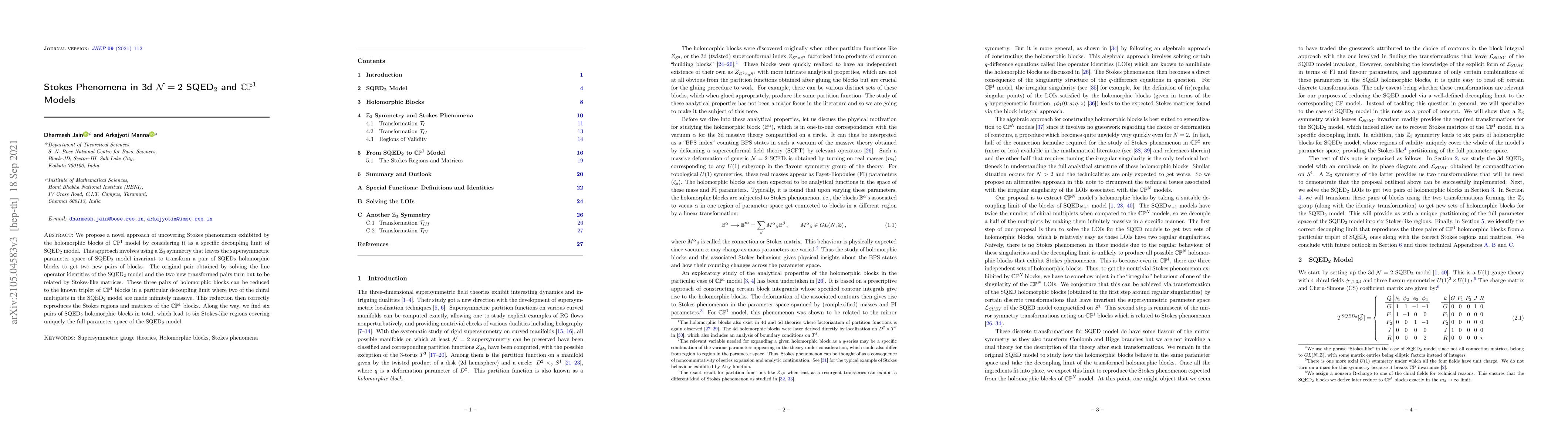 We propose a novel approach of uncovering Stokes phenomenon exhibited by the holomorphic blocks of $\mathbb{CP}^1$ model by considering it as a specific decoupling limit of SQED$_2$ model. This approach involves using a $\mathbb{Z}_3$ symmetry that leaves the supersymmetric parameter space of SQED$_2$ model invariant to transform a pair of SQED$_2$ holomorphic blocks to get two new pairs of blocks. The original pair obtained by solving the line operator identities of the SQED$_2$ model and the two new transformed pairs turn out to be related by Stokes-like matrices. These three pairs of holomorphic blocks can be reduced to the known triplet of $\mathbb{CP}^1$ blocks in a particular decoupling limit where two of the chiral multiplets in the SQED$_2$ model are made infinitely massive. This reduction then correctly reproduces the Stokes regions and matrices of the $\mathbb{CP}^1$ blocks. Along the way, we find six pairs of SQED$_2$ holomorphic blocks in total, which lead to six Stokes-like regions covering uniquely the full parameter space of the SQED$_2$ model.