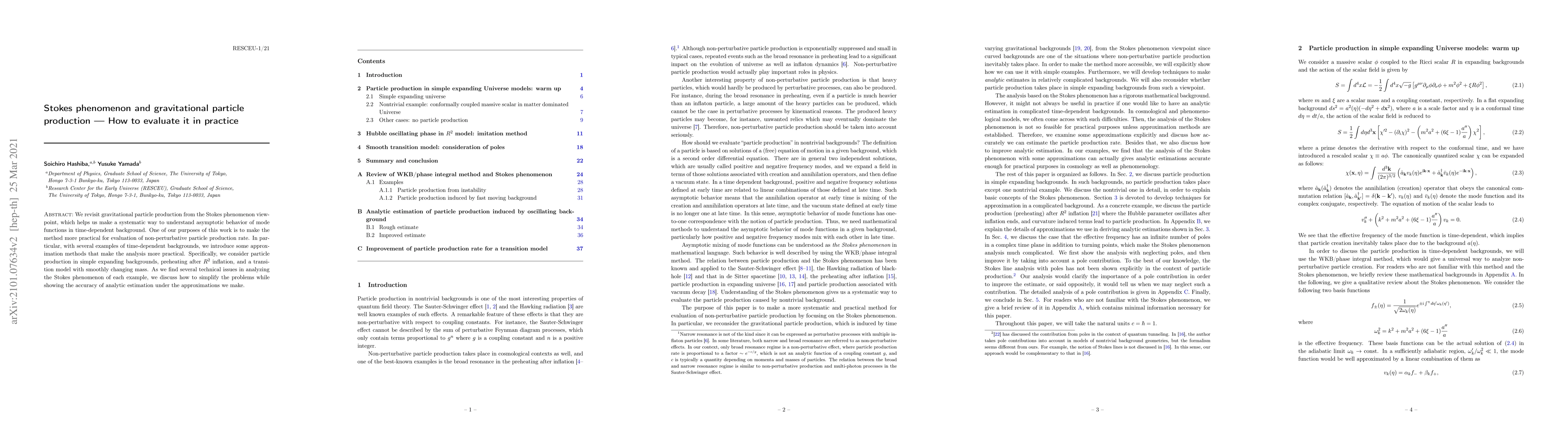 This paper explores gravitational particle production through the Stokes phenomenon, providing a systematic approach to understand the asymptotic behavior of mode functions in time-dependent backgrounds. It introduces practical approximation methods for evaluating non-perturbative production rates, illustrated through examples like expanding universe models, preheating after $R^2$ inflation, and transition models with changing mass, while addressing technical issues and maintaining analytical accuracy.