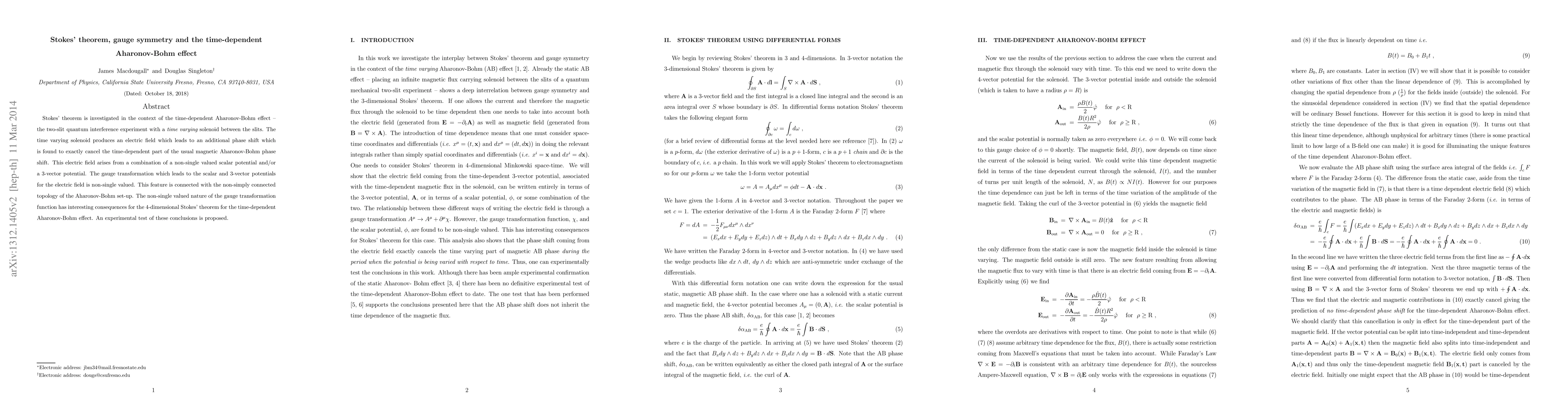 This paper explores Stokes' theorem in relation to the time-dependent Aharonov-Bohm effect, revealing that a time-varying solenoid generates an electric field canceling the time-dependent magnetic phase shift. The non-single valued gauge transformation linked to this electric field reflects the non-simply connected topology of the setup, with implications for 4-dimensional Stokes' theorem and a proposed experimental test.