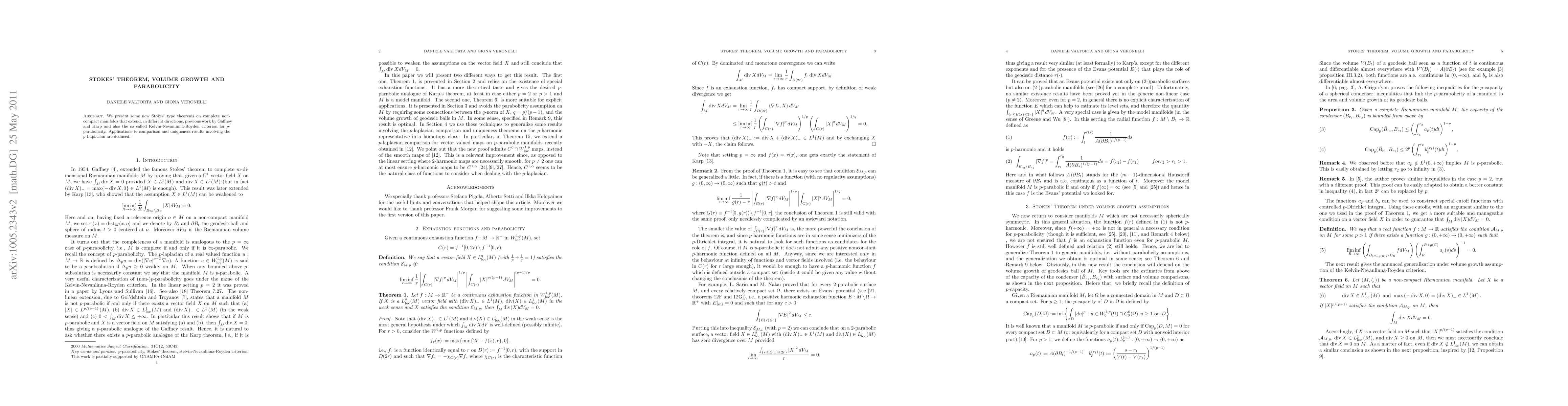 This research introduces novel Stokes' theorem extensions for complete non-compact manifolds, building upon previous works by Gaffney, Karp, Kelvin-Nevanlinna-Royden, and advancing the understanding of (p)-parabolicity. These theorems lead to comparison and uniqueness results concerning the p-Laplacian.