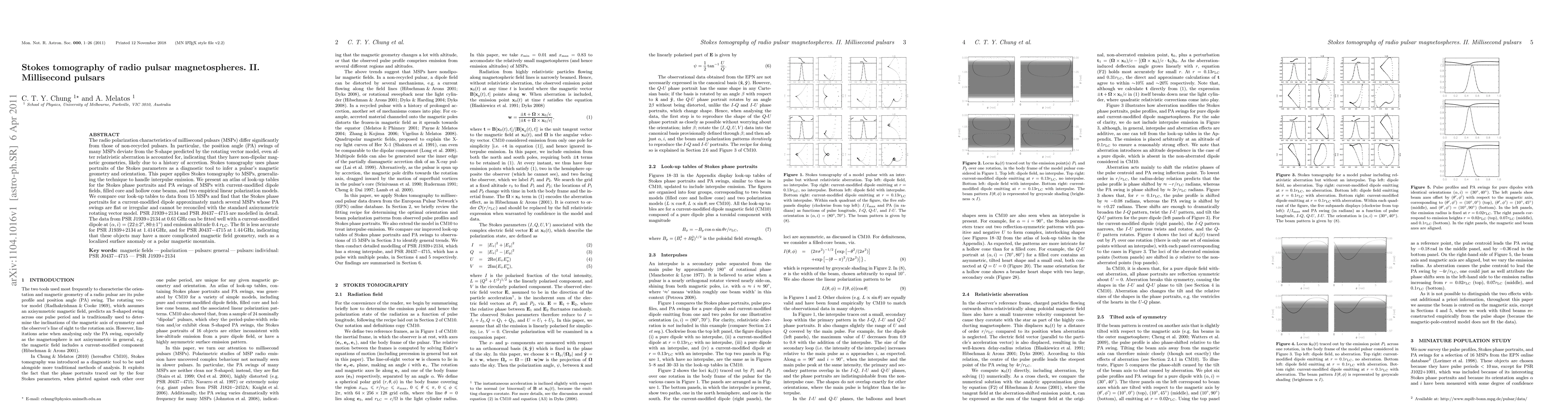 The radio polarization characteristics of millisecond pulsars (MSPs) differ significantly from those of non-recycled pulsars. In particular, the position angle (PA) swings of many MSPs deviate from the S-shape predicted by the rotating vector model, even after relativistic aberration is accounted for, indicating that they have non-dipolar magnetic geometries, likely due to a history of accretion. Stokes tomography uses phase portraits of the Stokes parameters as a diagnostic tool to infer a pulsar's magnetic geometry and orientation. This paper applies Stokes tomography to MSPs, generalizing the technique to handle interpulse emission. We present an atlas of look-up tables for the Stokes phase portraits and PA swings of MSPs with current-modified dipole fields, filled core and hollow cone beams, and two empirical linear polarization models. We compare our look-up tables to data from 15 MSPs and find that the Stokes phase portraits for a current-modified dipole approximately match several MSPs whose PA swings are flat or irregular and cannot be reconciled with the standard axisymmetric rotating vector model. PSR J1939+2134 and PSR J0437$-$4715 are modelled in detail. The data from PSR J1939+2134 at 0.61\,GHz can be fitted well with a current-modified dipole at $(\alpha, i) = (22 \pm 2^\circ, 80 \pm 1^\circ)$ and emission altitude 0.4 $r_\text{LC}$. The fit is less accurate for PSR J1939+2134 at 1.414\,GHz, and for PSR J0437$-$4715 at 1.44\,GHz, indicating that these objects may have a more complicated magnetic field geometry, such as a localized surface anomaly or a polar magnetic mountain.