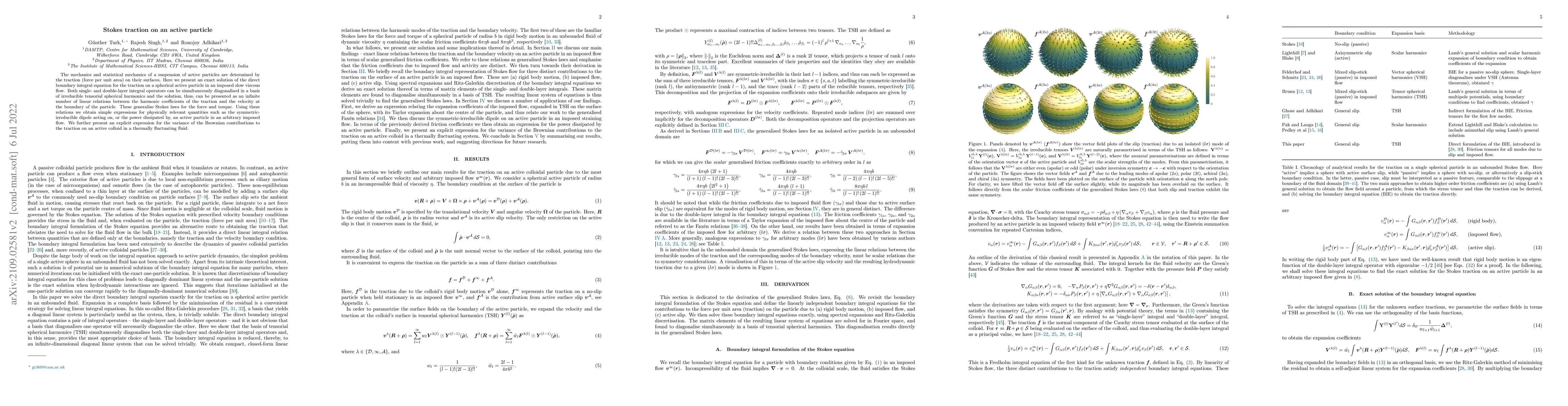 The mechanics and statistical mechanics of a suspension of active particles are determined by the traction (force per unit area) on their surfaces. Here we present an exact solution of the direct boundary integral equation for the traction on a spherical active particle in an imposed slow viscous flow. Both single- and double-layer integral operators can be simultaneously diagonalised in a basis of irreducible tensorial spherical harmonics and the solution, thus, can be presented as an infinite number of linear relations between the harmonic coefficients of the traction and the velocity at the boundary of the particle. These generalise Stokes laws for the force and torque. Using these relations we obtain simple expressions for physically relevant quantities such as the symmetric-irreducible dipole acting on, or the power dissipated by, an active particle in an arbitrary imposed flow. We further present an explicit expression for the variance of the Brownian contributions to the traction on an active colloid in a thermally fluctuating fluid.