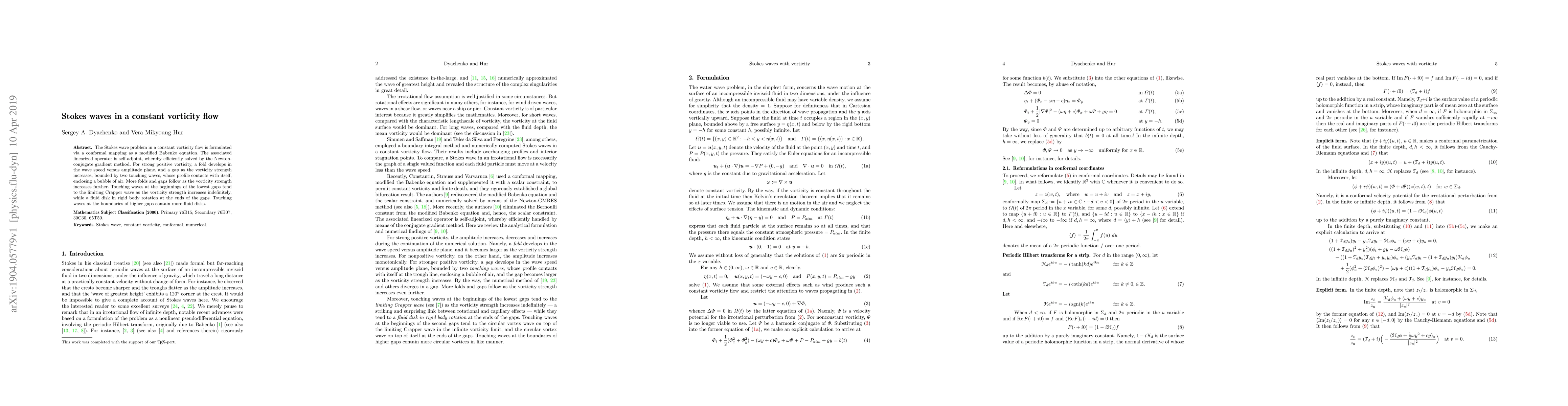 Researchers investigate the behavior of Stokes waves in a constant vorticity flow, discovering that as vorticity strength increases, wave speed versus amplitude planes exhibit folds and gaps with varying fluid dynamics characteristics.