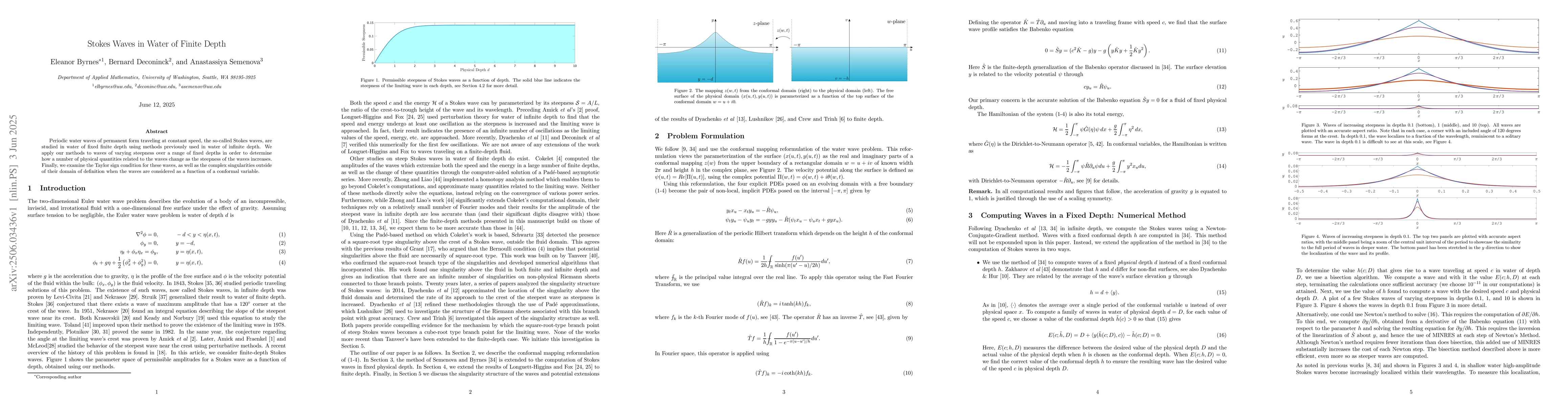 Researchers studied Stokes waves in water of finite depth, finding how physical quantities change with wave steepness, and examined the Taylor sign condition and complex singularities outside the wave's domain.
