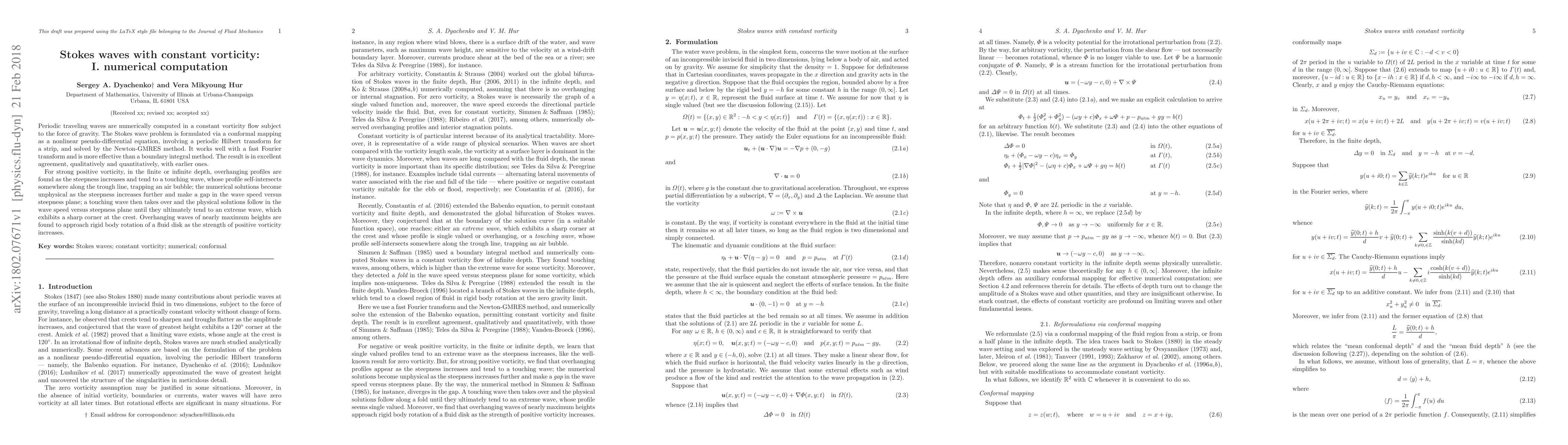 This paper numerically computes periodic traveling waves in a constant vorticity flow under gravity, solving the Stokes wave problem via a conformal mapping and the Newton-GMRES method. It finds overhanging wave profiles that self-intersect and trap air bubbles, transitioning to extreme waves with sharp crests as steepness increases.
