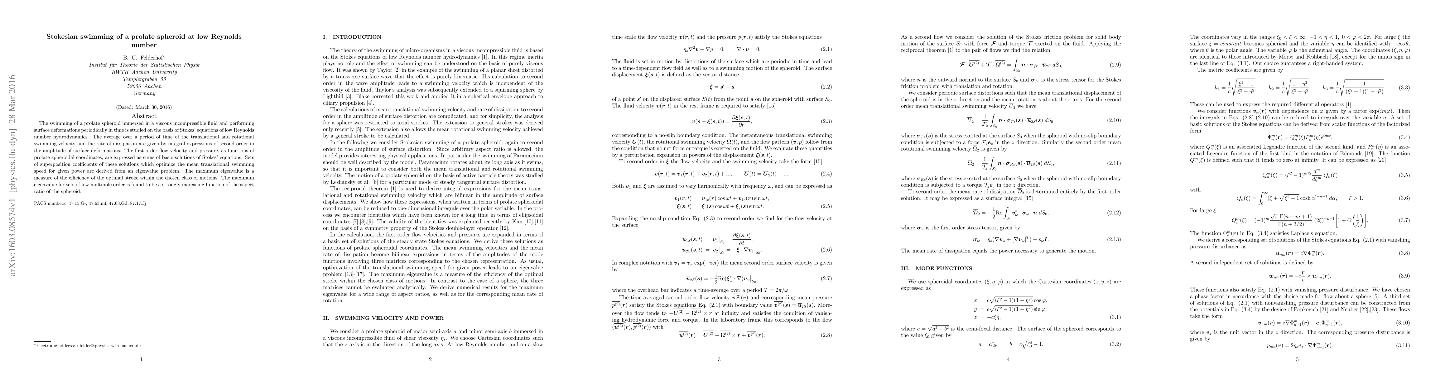 This paper investigates the low Reynolds number hydrodynamics of a prolate spheroid swimming through a viscous fluid by periodically deforming its surface. It derives expressions for the average swimming velocity and dissipation, and finds that the optimal swimming speed for given power is strongly dependent on the spheroid's aspect ratio, with higher aspect ratios yielding greater efficiency.