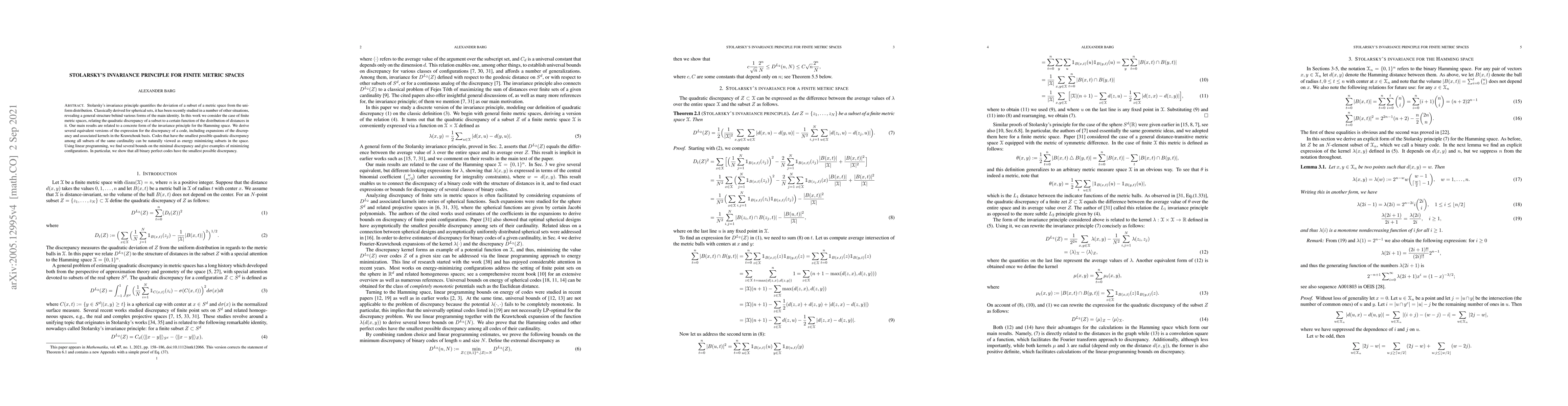 This paper explores Stolarsky's invariance principle in finite metric spaces, specifically the Hamming space, to quantify the deviation of subsets from uniform distribution. It derives equivalent expressions for the quadratic discrepancy of codes and demonstrates that binary perfect codes minimize this discrepancy.