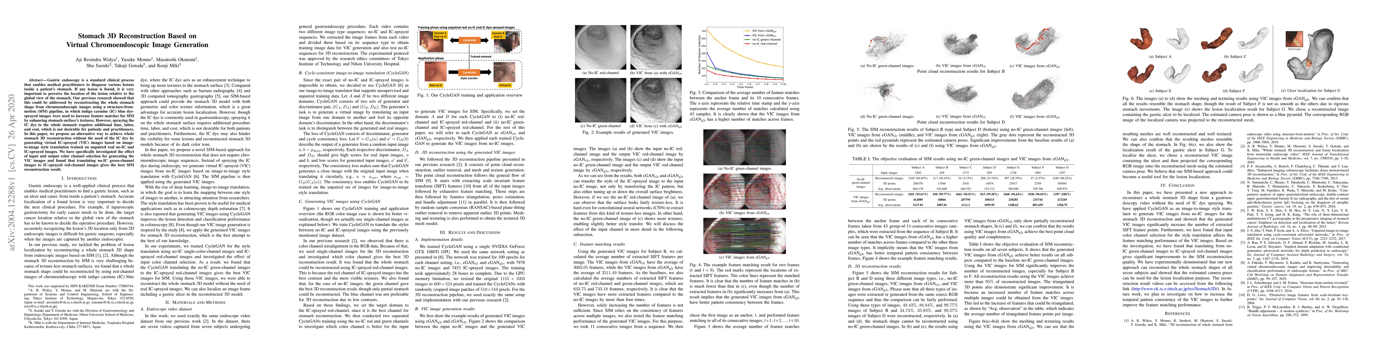 Gastric endoscopy is a standard clinical process that enables medical practitioners to diagnose various lesions inside a patient's stomach. If any lesion is found, it is very important to perceive the location of the lesion relative to the global view of the stomach. Our previous research showed that this could be addressed by reconstructing the whole stomach shape from chromoendoscopic images using a structure-from-motion (SfM) pipeline, in which indigo carmine (IC) blue dye sprayed images were used to increase feature matches for SfM by enhancing stomach surface's textures. However, spraying the IC dye to the whole stomach requires additional time, labor, and cost, which is not desirable for patients and practitioners. In this paper, we propose an alternative way to achieve whole stomach 3D reconstruction without the need of the IC dye by generating virtual IC-sprayed (VIC) images based on image-to-image style translation trained on unpaired real no-IC and IC-sprayed images. We have specifically investigated the effect of input and output color channel selection for generating the VIC images and found that translating no-IC green-channel images to IC-sprayed red-channel images gives the best SfM reconstruction result.