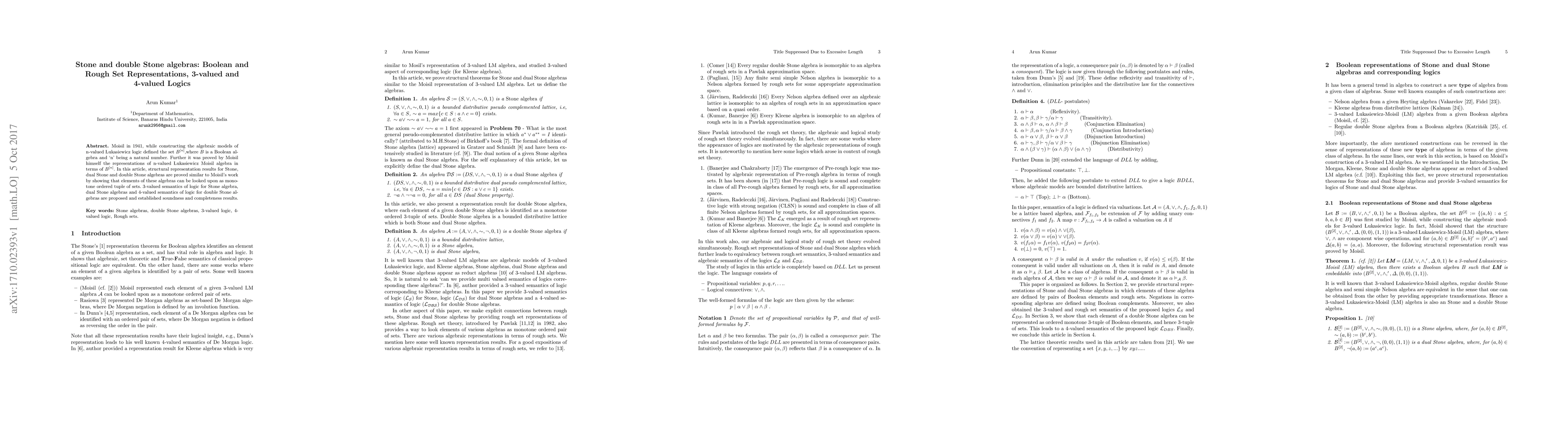 Moisil in 1941, while constructing the algebraic models of n-valued {\L}ukasiewicz logic defined the set $B^{[n]}$,where $B$ is a Boolean algebra and `n' being a natural number. Further it was proved by Moisil himself the representations of n-valued {\L}ukasiewicz Moisil algebra in terms of $B^{[n]}$. In this article, structural representation results for Stone, dual Stone and double Stone algebras are proved similar to Moisil's work by showing that elements of these algebras can be looked upon as monotone ordered tuple of sets. 3-valued semantics of logic for Stone algebra, dual Stone algebras and 4-valued semantics of logic for double Stone algebras are proposed and established soundness and completeness results.