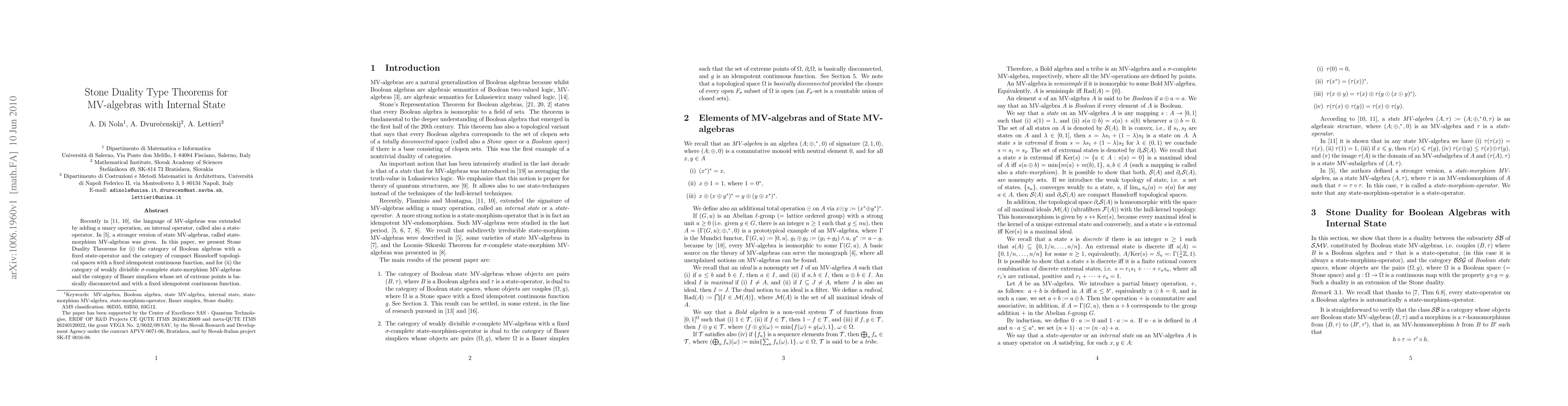 Recently in \cite{FM, FlMo}, the language of MV-algebras was extended by adding a unary operation, an internal operator, called also a state-operator. In \cite{DD1}, a stronger version of state MV-algebras, called state-morphism MV-algebras was given. In this paper, we present Stone Duality Theorems for (i) the category of Boolean algebras with a fixed state-operator and the category of compact Hausdorff topological spaces with a fixed idempotent continuous function, and for (ii) the category of weakly divisible $\sigma$-complete state-morphism MV-algebras and the category of Bauer simplices whose set of extreme points is basically disconnected and with a fixed idempotent continuous function.