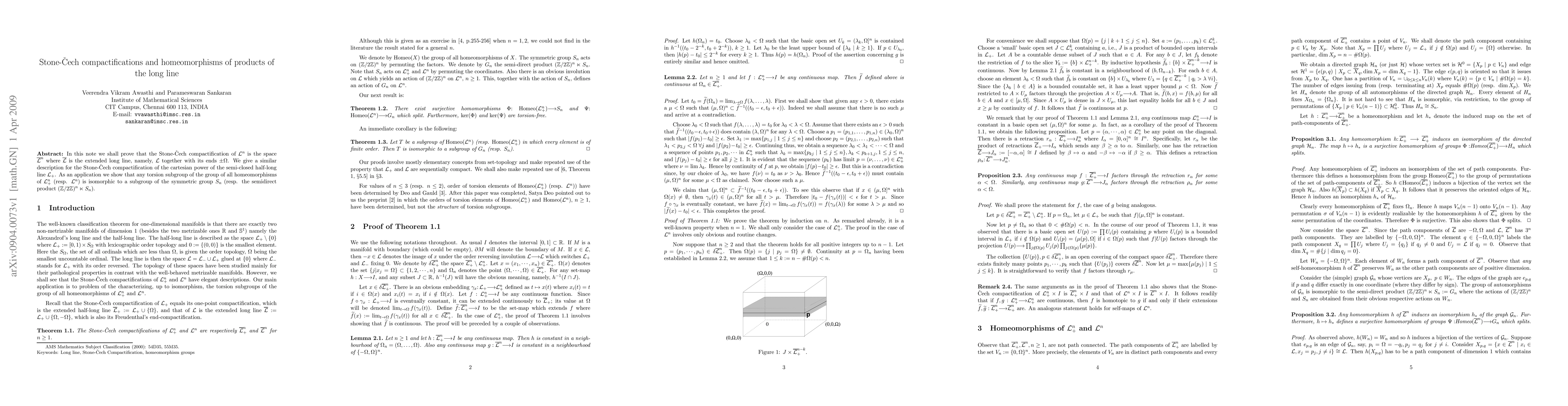 This paper proves that the Stone-\v{C}ech compactification of the n-fold product of the long line is isomorphic to the extended long line with its ends. It also shows that any torsion subgroup of the homeomorphism group of these products is isomorphic to a subgroup of either the symmetric group $S_n$ or the semidirect product $(\bz/2\bz)^n\ltimes S_n$.
