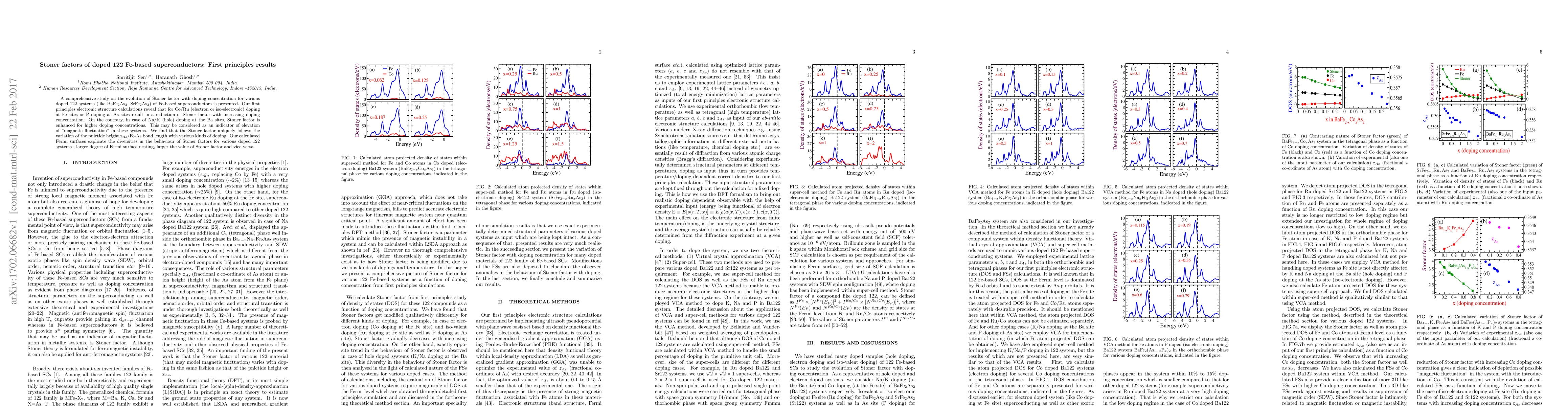 This study investigates the Stoner factor's evolution with doping concentration in various 122 Fe-based superconductors using first principles calculations. It finds that electron doping or iso-electronic doping reduces the Stoner factor, while hole doping enhances it, indicating changes in magnetic fluctuations.