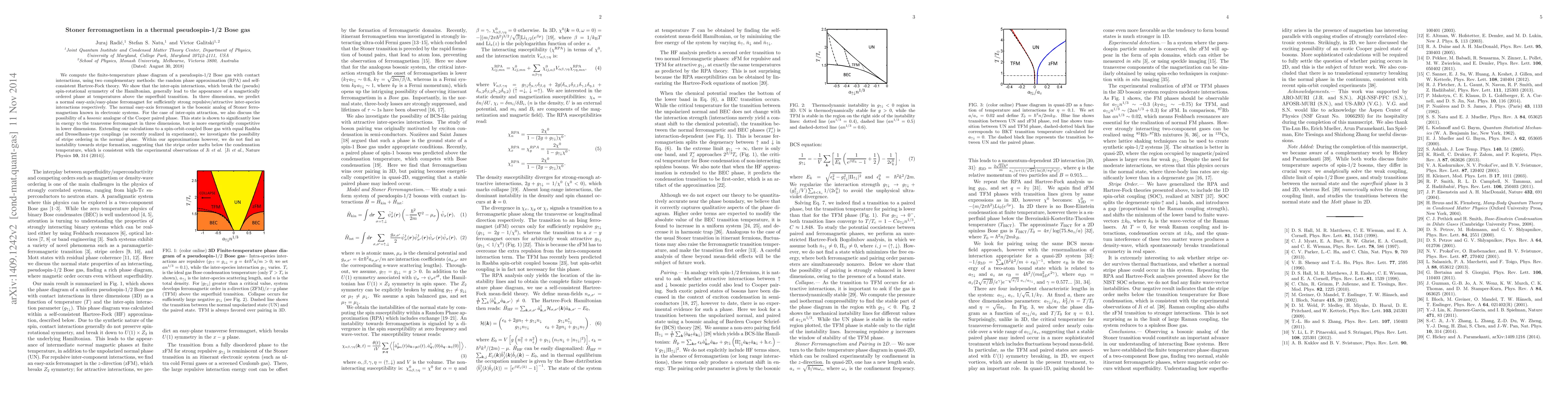 This paper investigates the phase diagram of a pseudospin-$1/2$ Bose gas at finite temperatures, revealing the emergence of a magnetically ordered phase above the superfluid transition due to inter-spin interactions. It predicts a normal easy-axis ferromagnet in three dimensions, analogous to Stoner ferromagnetism in electronic systems, and discusses the potential of a bosonic Cooper paired phase.