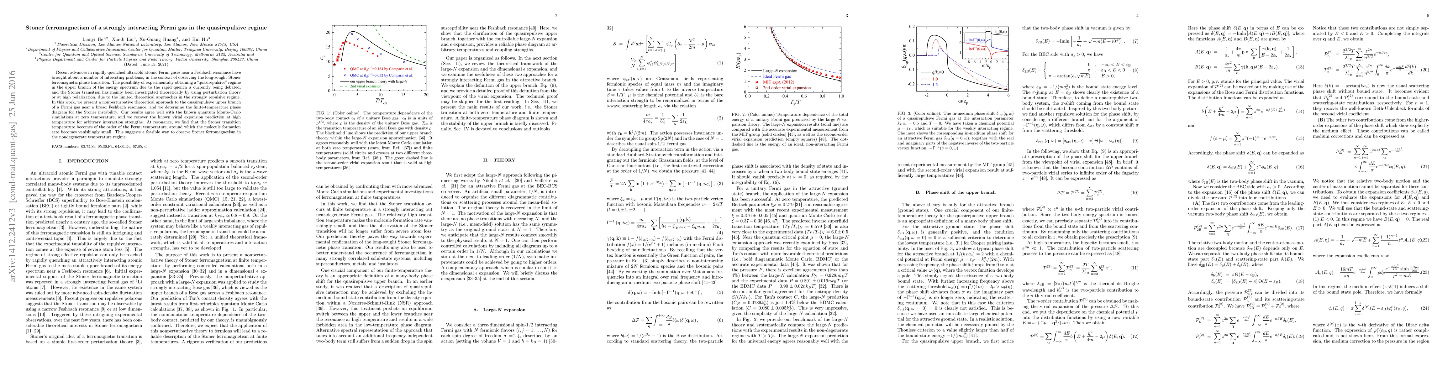 Recent advances in rapidly quenched ultracold atomic Fermi gases near a Feshbach resonance have brought about a number of interesting problems, in the context of observing the long-sought Stoner ferromagnetic phase transition. The possibility of experimentally obtaining a "quasirepulsive" regime in the upper branch of the energy spectrum due to the rapid quench is currently being debated, and the Stoner transition has mainly been investigated theoretically by using perturbation theory or at high polarization, due to the limited theoretical approaches in the strongly repulsive regime. In this work, we present a nonperturbative theoretical approach to the quasirepulsive upper branch of a Fermi gas near a broad Feshbach resonance, and we determine the finite-temperature phase diagram for the Stoner instability. Our results agree well with the known quantum Monte-Carlo simulations at zero temperature, and we recover the known virial expansion prediction at high temperature for arbitrary interaction strengths. At resonance, we find that the Stoner transition temperature becomes of the order of the Fermi temperature, around which the molecule formation rate becomes vanishingly small. This suggests a feasible way to observe Stoner ferromagnetism in the nondegenerate temperature regime.