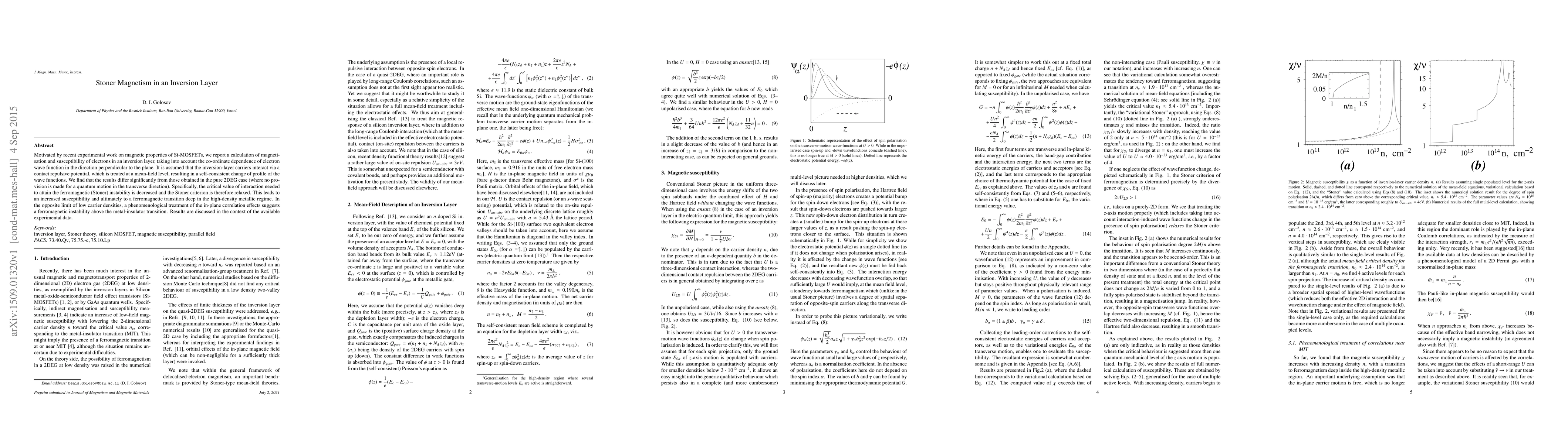 Motivated by recent experimental work on magnetic properties of Si-MOSFETs, we report a calculation of magnetisation and susceptibility of electrons in an inversion layer, taking into account the co-ordinate dependence of electron wave function in the direction perpendicular to the plane. It is assumed that the inversion-layer carriers interact via a contact repulsive potential, which is treated at a mean-field level, resulting in a self-consistent change of profile of the wave functions. We find that the results differ significantly from those obtained in the pure 2DEG case (where no provision is made for a quantum motion in the transverse direction). Specifically, the critical value of interaction needed to attain the ferromagnetic (Stoner) instability is decreased and the Stoner criterion is therefore relaxed. This leads to an increased susceptibility and ultimately to a ferromagnetic transition deep in the high-density metallic regime. In the opposite limit of low carrier densities, a phenomenological treatment of the in-plane correlation effects suggests a ferromagnetic instability above the metal-insulator transition. Results are discussed in the context of the available experimental data.