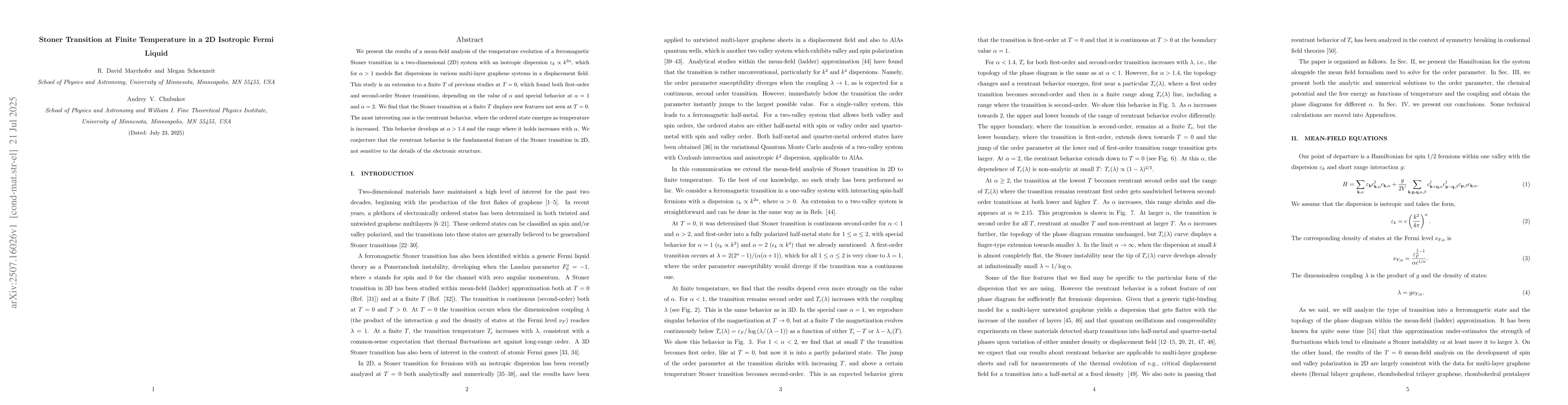 We present the results of a mean-field analysis of the temperature evolution of a ferromagnetic Stoner transition in a two-dimensional (2D) system with an isotropic dispersion $\varepsilon_k \propto k^{2\alpha}$, which for $\alpha >1$ models flat dispersions in various multi-layer graphene systems in a displacement field. This study is an extension to a finite $T$ of previous studies at $T=0$, which found both first-order and second-order Stoner transitions, depending on the value of $\alpha$ and special behavior at $\alpha =1$ and $\alpha =2$. We find that the Stoner transition at a finite $T$ displays new features not seen at $T=0$. The most interesting one is the reentrant behavior, where the ordered state emerges as temperature is increased. This behavior develops at $\alpha >1.4$ and the range where it holds increases with $\alpha$. We conjecture that the reentrant behavior is the fundamental feature of the Stoner transition in 2D, not sensitive to the details of the electronic structure.