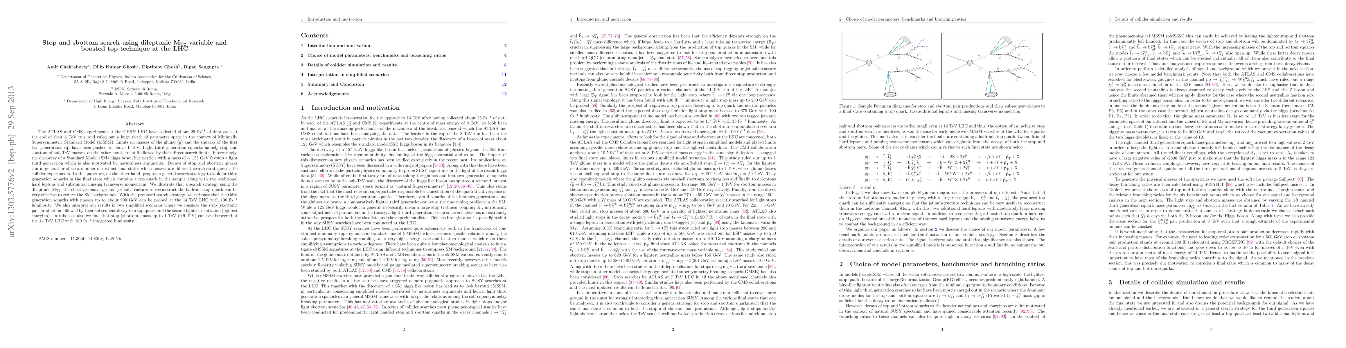 The ATLAS and CMS experiments at the CERN LHC have collected about 20 $fb^{-1}$ of data each at the end of their 8 TeV run, and ruled out a huge swath of parameter space in the context of Minimally Supersymmetric Standard Model(MSSM). Limits on masses of the gluino ($\tilde{g}$) and the squarks of the first two generations($\tilde{q}$) have been pushed to the TeV range. Light third generation squarks namely stop and sbottom of sub-TeV masses, on the other hand, are still allowed by their direct search limits. Interestingly, the discovery of a Standard Model(SM) higgs boson like particle with a mass of $\sim$ 125 GeV favours a light third generation which is also motivated by naturalness arguments. Decays of stop and sbottom quarks can in general produce a number of distinct final states which necessitate different search strategies in the collider experiments. In this paper we, on the other hand, propose a general search strategy to look for third generation squarks in the final state which contains a top quark in the sample along with two additional hard leptons and substantial missing transverse momentum. We illustrate that a search strategy using the dileptonic $M_{T2}$, the effective mass $m_{eff}$ and jet substructure to reconstruct the hadronic top quark can be very effective to reduce the SM backgrounds. With the proposed search strategy, we estimate that the third generation squarks with masses up to about 800 GeV can be probed at the 14 TeV LHC with a 100 $fb^{-1}$ data set. We also interpret our results in two simplified scenarios where we consider the stop (sbottom) pair production followed by their subsequent decay to a top quark and the second lightest neutralino (lightest chargino). In this case also we find that stop (sbottom) mass up to 1 TeV (0.9 TeV) can be discovered at the 14 TeV LHC with 100 $fb^{-1}$ integrated luminosity.