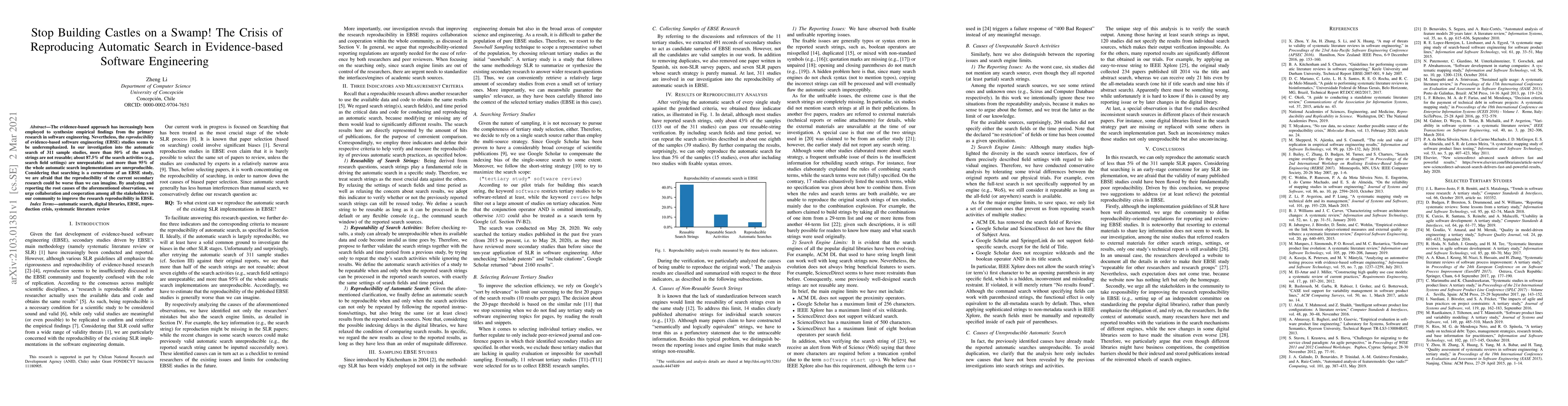 The evidence-based approach has increasingly been employed to synthesize empirical findings from the primary research in software engineering. Nevertheless, the reproducibility of evidence-based software engineering (EBSE) studies seems to be underemphasized. In our investigation into the automatic search of 311 sample studies, more than 50% of the search strings are not reusable; about 87.5% of the search activities (e.g., search field settings) are unrepeatable; and more than 95% of the whole automatic search implementations are unreproducible. Considering that searching is a cornerstone of an EBSE study, we are afraid that the reproducibility of the current secondary research could be worse than we can imagine. By analyzing and reporting the root causes of the aforementioned observations, we urge collaboration and cooperation among all the stakeholders in our community to improve the research reproducibility in EBSE.