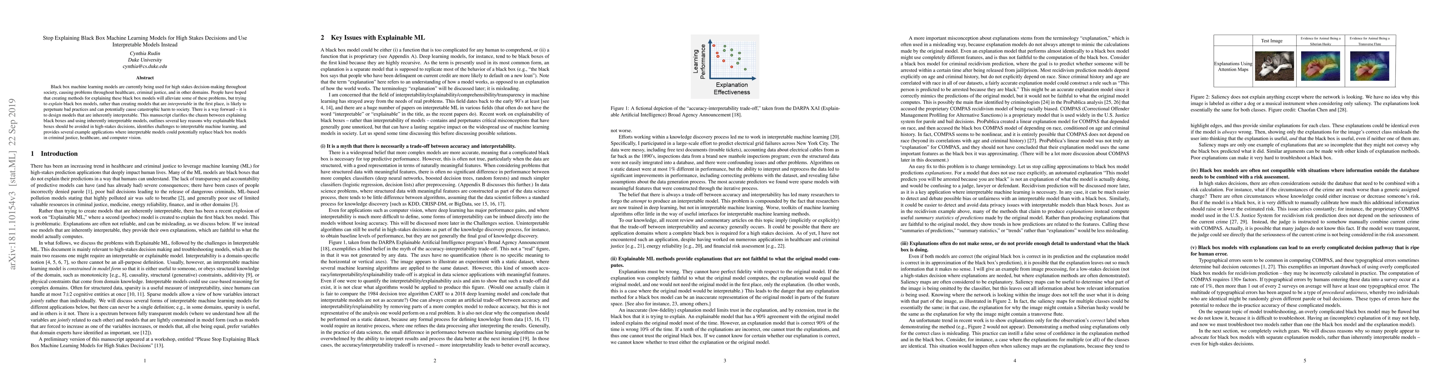 This paper argues that instead of attempting to explain black box machine learning models for high stakes decisions, inherently interpretable models should be designed. It highlights the risks of relying on explainable black boxes and suggests that interpretable models are essential to avoid potential societal harm in domains like healthcare and criminal justice.